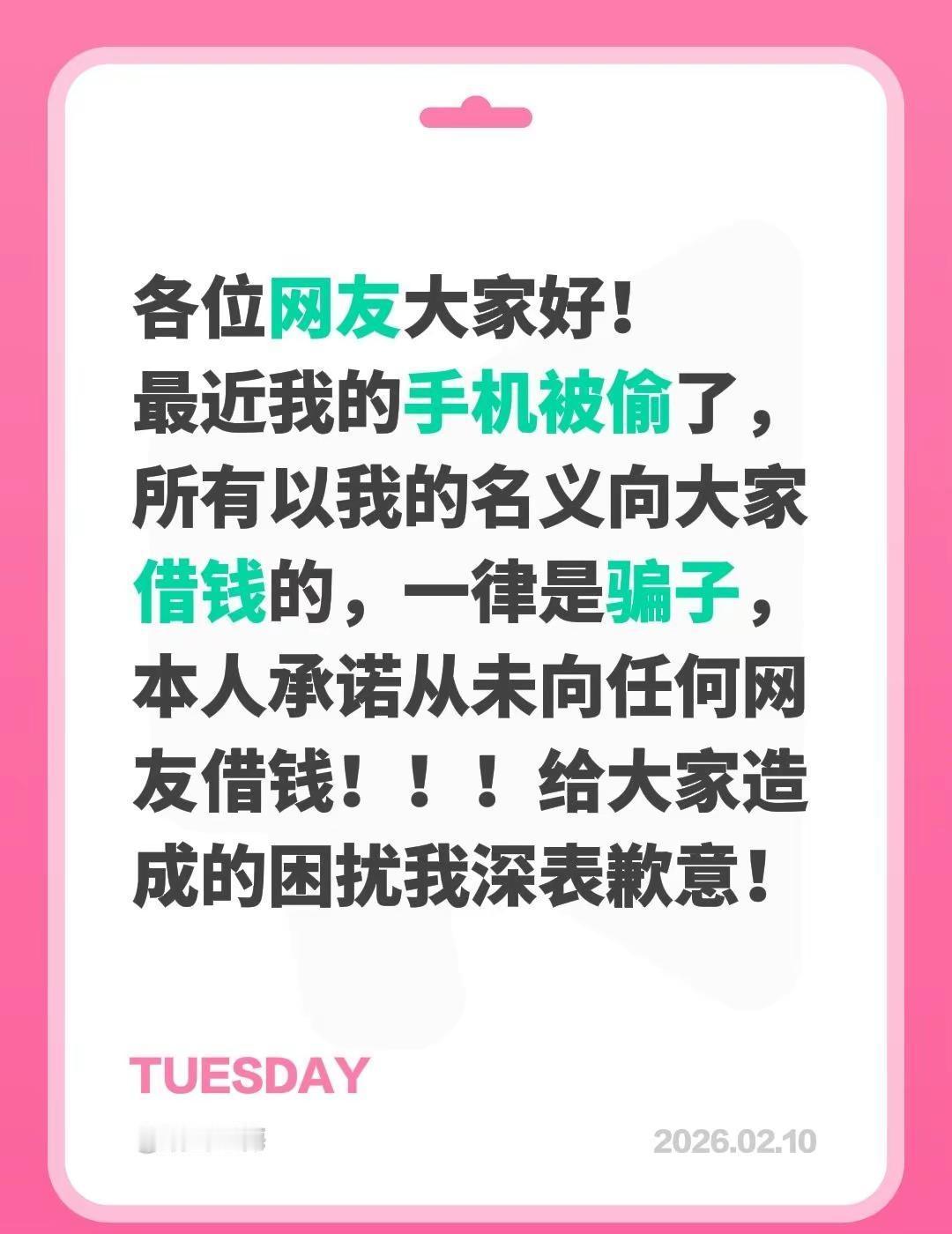 各位网友大家好!最近我的手机被偷了,所有以我的名义向大家借钱的,一律是骗子,本人承诺从未向任何网友借钱!!!给大家造成的困扰我深表歉意!
