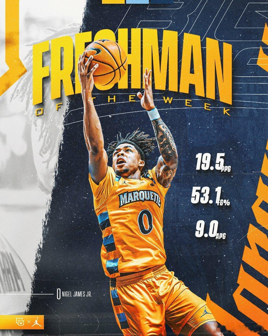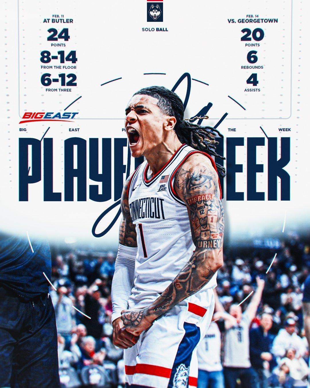 Big East联盟第15周表现奖(2025-2026赛季)。NCAA男篮最佳球员:Solo earns,最佳新生:Nigel James Jr。NCAA女篮最佳球员:Azzi Fudd,最佳新生:Zahara Bishop。