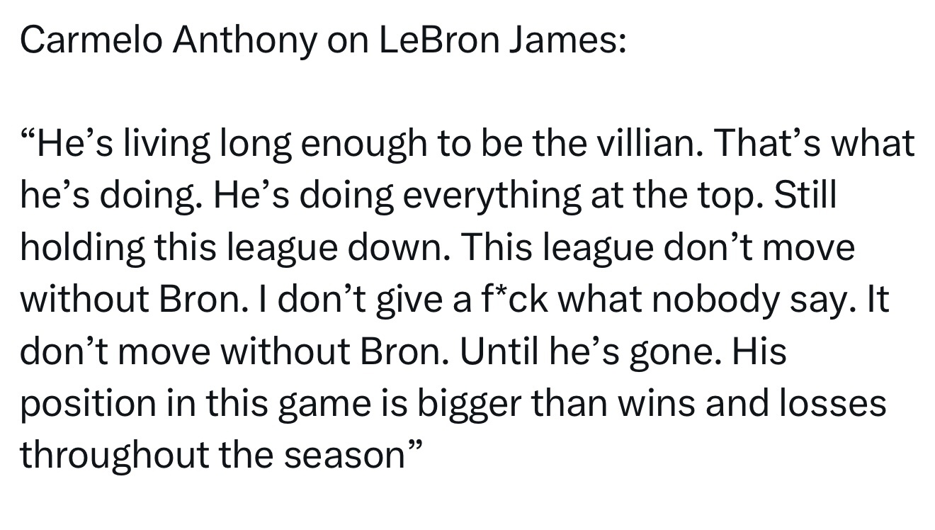 “他在这联盟待得够久,久到成了反派角色。这就是他现在的情况。他依然在顶峰做到了一切,依然支撑着这个联盟。没有勒布朗,这个联盟根本转不动。我不管别人怎么说,没有勒布朗就是不行。除非他退役了。他在这个联盟里的地位,已经超越了赛季输赢本身。”