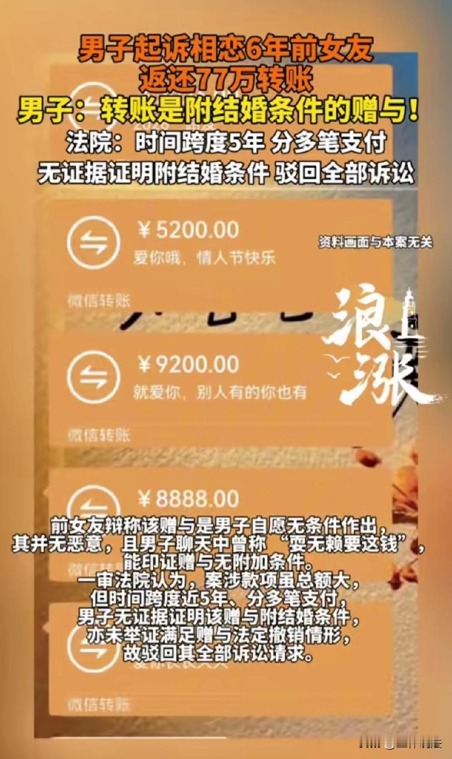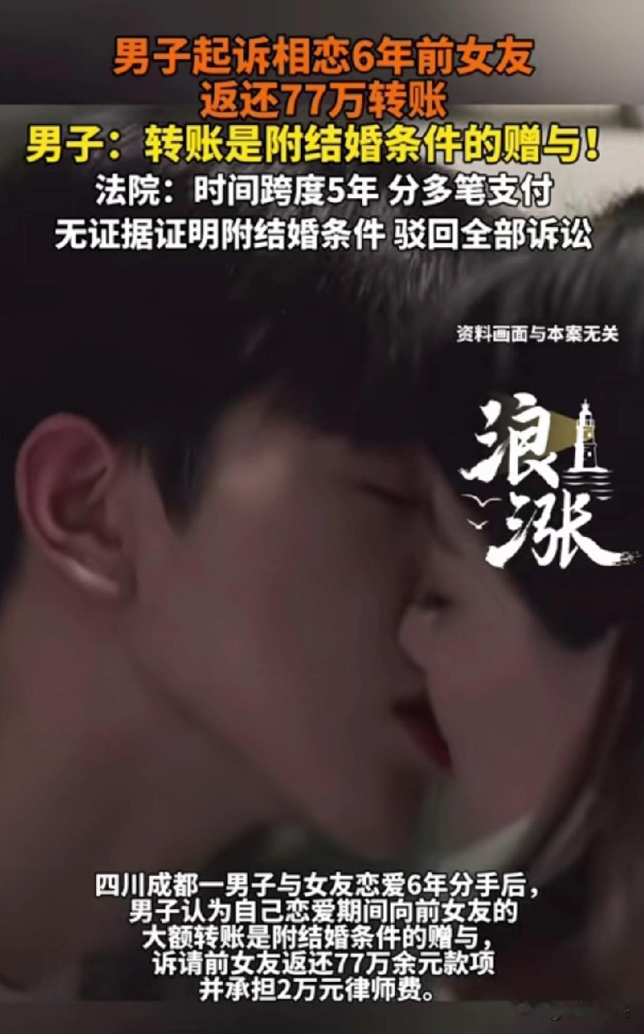 代价太大了!四川成都,男子和女友恋爱6年,为了能早日修成正果,他对女友非常慷慨,前前后后转账77万元,可还是没能步入婚姻殿堂,走到了分手的地步。分手后,男子要求女友退还这77万转账,女友:这都是你自愿给的,哪有要回去的道理?男子把女友告上法庭,法院的判决令人意想不到! 男子李先生和女友谈了整整六年的恋爱,一心想着和对方走进婚姻,把这段感情好好经营下去。 为了让女友安心,也为了早日修成正果,李先生在恋爱期间对女友格外大方,不管是日常开销、节日红包,还是女友需要用钱的时候,他都毫不犹豫地转账。 这6年下来,李先生前前后后一共给女友转了77万多元。 在他心里,这些钱都是为了两个人的未来花的,他坚信两人一定会结婚,所以从来没计较过钱的事情,只觉得真心付出总能换来圆满的结局。 可现实并没有如他所愿,六年的爱情长跑,最终还是走到了分手的地步。 分手之后,李先生越想越不是滋味,自己付出了六年的时间和七十多万的钱财,最后却没能和对方结婚,心里满是委屈和不甘。 李先生觉得,这些转账不是普通的恋爱花销,而是以结婚为目的的附条件赠与,现在婚没结成,女友就应该把钱退回来。 于是,男子主动找到前女友,提出让对方返还这77万转账。 可前女友直接拒绝了,她觉得这些钱都是男子自愿给的,恋爱期间你情我愿的付出,哪有分手了再要回去的道理。 两人为此吵得不可开交,彻底闹僵了。 前女友还拿出两人的聊天记录,里面男子曾说过“耍无赖要这钱”之类的话。 她觉得这正好能证明,男子当初转账就是无条件的赠与,根本没有附加结婚的条件。 多次沟通无果后,李先生一气之下把前女友告上了法庭,不仅要求对方返还77万余元的转账,还要求对方承担2万元的律师费。 法庭上,李先生坚持自己的主张,强调所有转账都是以结婚为前提,属于附条件的赠与,现在分手导致结婚目的无法实现,钱款理应返还。 《民法典》第158条规定:民事法律行为可以附条件,但是根据其性质不得附条件的除外。附生效条件的民事法律行为,自条件成就时生效;附解除条件的民事法律行为,自条件成就时失效。 李先生恋爱6年陆续转账77万,远超日常恋爱消费,其主观上是以“结婚”为核心目的的附解除条件赠与。 赠与这77万的条件就是“双方结婚”,若最终未结婚,赠与所附条件未成就,赠与行为应失效,前女友应返还全部款项。 从司法实践来看,恋爱期间大额、长期、无特殊寓意的转账,通常被认定为以结婚为目的的附条件赠与,分手即条件不成就,赠与人有权主张返还 。 可谁知,一审法院经过审理后,给出了出乎意料的判决结果。 法院认为,虽然这笔钱总额高达77万,但时间跨度接近五年,是分很多笔陆续支付的,男子并没有拿出有力的证据,证明这些转账是附结婚条件的赠与,同时也没有证据证明这笔钱符合法律规定的赠与撤销情形。 基于上述理由,一审法院驳回了李先生的全部诉讼请求。 李先生对一审判决不服,心里还是觉得自己的钱不该白白打水漂,于是提起了上诉。 二审期间,他特意提交了自己的收入明细、和女友相处期间的消费凭证等新证据,想以此证明自己的转账确实是为了结婚,并非无条件赠与。 《民法典》第658条规定:赠与人在赠与财产的权利转移之前可以撤销赠与。经过公证的赠与合同或者依法不得撤销的具有救灾、扶贫、助残等公益、道德义务性质的赠与合同,不适用前款规定。 二审法院认为,77万虽总额大,但分多笔、跨近5年,李先生未提供聊天记录、书面约定、转账备注等直接证据证明“以结婚为条件”。 其提交的收入明细、消费凭证,仅能证明转账事实,无法证明双方有结婚合意与附条件约定。 且财产已转移完成,不符合任意撤销的前提,因此法院认定为一般无偿赠与,判决不予返还。 最终,二审法院经过审查,还是没有采信李先生提交的新证据,驳回了他的上诉请求,维持了一审原判。 本以为真心付出、大额投入就能换来婚姻,却没想到因为没有明确的约定和证据,最后钱和感情都落了空。