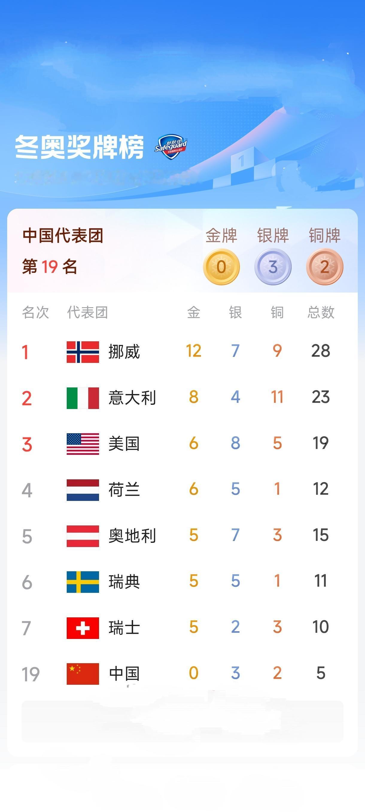 中国冬奥代表团截止2月17日,依然是一金难求!北欧冬奥强国挪威代表团以12金7银9铜共28枚奖牌高居榜首。中国冬奥代表团只获得3银2铜,排名第十九,相较于上届北京冬奥会的9金呈现断涯式下滑,在赛事还剩6天的情况下,中国冬奥队还有4一6个夺金点,能否实现金牌零的突破,拭目以待!