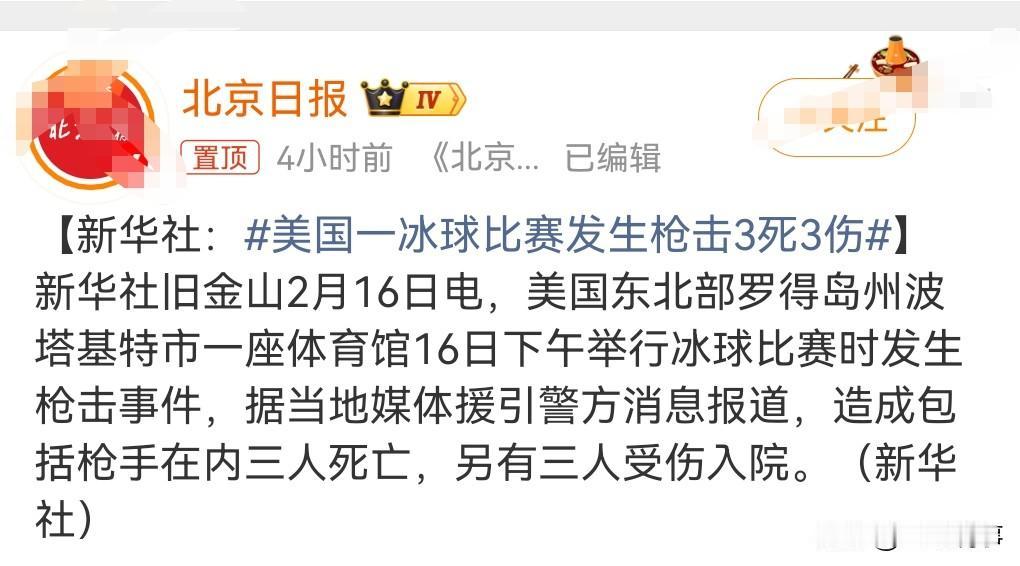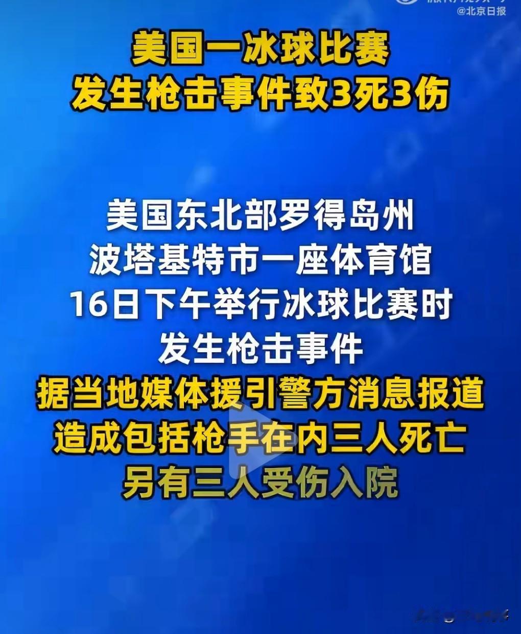 这就是不禁枪的后果。 2月16日,美国一冰球比赛发生枪击,包括凶手在内共3死3伤。 这种事情真的是防不胜防,一旦持枪者想报复社会,那就容易发生这样的悲剧。 而且很多报复社会的都是去人多的地方行凶。