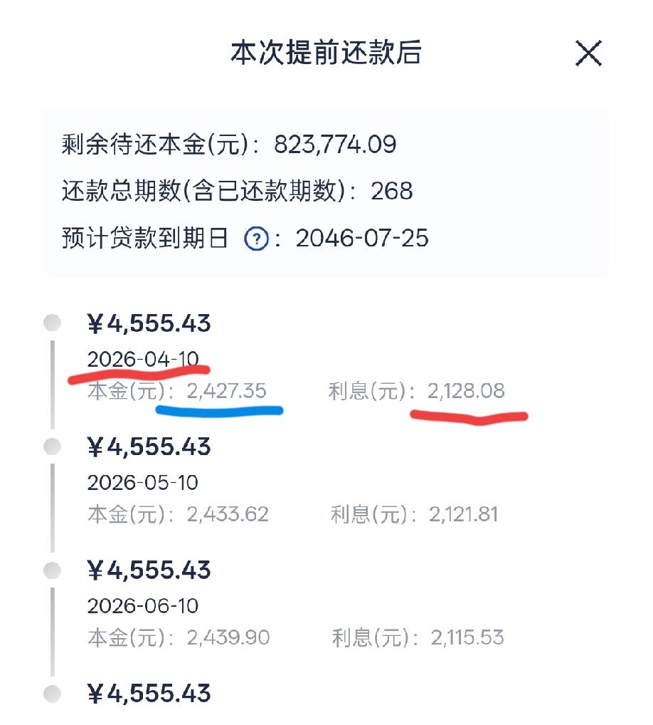 利息降了1000块,年限缩短8年,心里真高兴!不用等到70岁还再背房贷喽。 过完年后,我把赔了5年的基金,赔了6万块卖掉,直接放到房贷提前还款里面,不管他三七二十一了,利息的金额越来越少,我心里痛快的狠[捂脸]。 鱼和熊掌不可兼得,原以为有钱不还房贷,放基金里,怎么也能跑赢利率3.1,其实是自己太天真了。 不过,回头是岸,40岁的我不能再瞎折腾了,踏实的过日子吧。 欠银行的你不还不行,基金套路你的,不还可以。 我已经醒悟了,不再听那些金融大咖的神操作,他们就是变相的传销组织,套路你…… 蓝线是还的本金,小红线是还的利息。 有没有被治愈的感觉呢[灵光一闪]