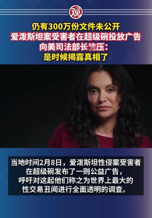 2月8日美国“超级碗”的黄金时段,当所有人都在为比赛欢呼时,一则广告却让整个美国沉默了,8位女性手里紧紧攥着自己童年时的照片,眼神坚定地对着镜头说“这个女孩,她配得上一个真相”。   她们不是流量明星,也不是政治说客,而是爱泼斯坦案的幸存者。   在这个全美收视率最高的广告时段,她们砸下重金,只为逼美国司法部长帕姆・邦迪做一件事,把那300万页被藏起来的文件,完完整整公之于众。   这事要从2019年说起,爱泼斯坦在狱中离奇死亡后,这起被称为“世界最大交易丑闻”的案件,就像被按下了静音键。   那些和他有牵连的权贵名流,仿佛一夜之间就从公众视野里消失了。   2025年11月特朗普签了个法案,拍着胸脯说要把所有相关文件都公开,给大家一个交代。   可到了2026年1月底,司法部只拿出了300万页文件,还有差不多同样多的内容,说啥也不肯放出来,理由是“要保护隐私”。   更讽刺的是,他们一边喊着“保护受害者”,一边却在已经公开的文件里,不小心泄露了几十名受害者的个人信息,这操作,简直是把“双标”两个字写在了脑门上。   所以,这些受害者才决定在超级碗上“破釜沉舟”,她们要的不是赔偿,也不是报复,就是想知道,当年那些有权有势的人到底是谁?为什么可以逍遥法外。   这则广告被美国参议院少数党领袖舒默称作 “超级碗周日最有分量的一条广告”,因为它像一把尖刀,狠狠划开了美国司法体系那块遮羞的布。   当法律成了权贵的保护伞,普通人要讨个公道,居然要跑到最贵的广告时段去喊冤。   司法部的回应还是那套官腔:“我们依法办事,保持透明。”   可所谓的 “透明”,就是只让国会议员在小黑屋里看,普通老百姓连边都摸不着,这分明是“选择性透明”。   而这些女人太勇敢了,她们没有被吓倒,也没有选择忍气吞声,她们用自己的伤疤提醒所有人,正义从来不会自己找上门,你不喊它就当你不存在。   虽然我们不知道那三百万页文件里到底藏着多少名字、多少肮脏的秘密,但我们知道只要这些受害者不放弃,只要还有人愿意听她们的声音,真相就总有被揭开的那一天。   这束从超级碗射出来的光,终会刺破所有黑暗。