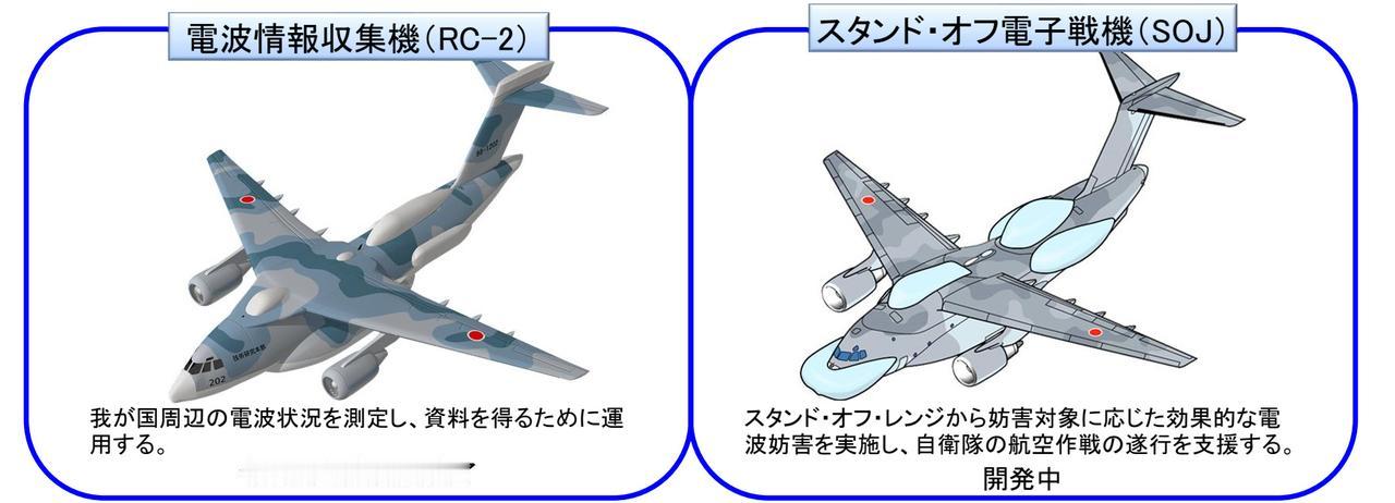 第二代“鸭嘴兽”,日本C2运输机改的SOJ电子战飞机。 新型C-2电子侦察机通过在机头、机身两侧、主翼末端以及垂直尾翼顶部整流罩安装天线,具有远距离捕获和干扰宽带信号并调查敌机的方向和位置的能力。该机使用高度自动化的系统来收集、处理和传输对方陆地、海上和空中情报和数据。 C-2 SOJ预计将在2026年具备实战能力,其电子战系统能与军事信息网络无缝对接,实现实时情报共享,提升作战指挥效率与准确性,计划采购4架。