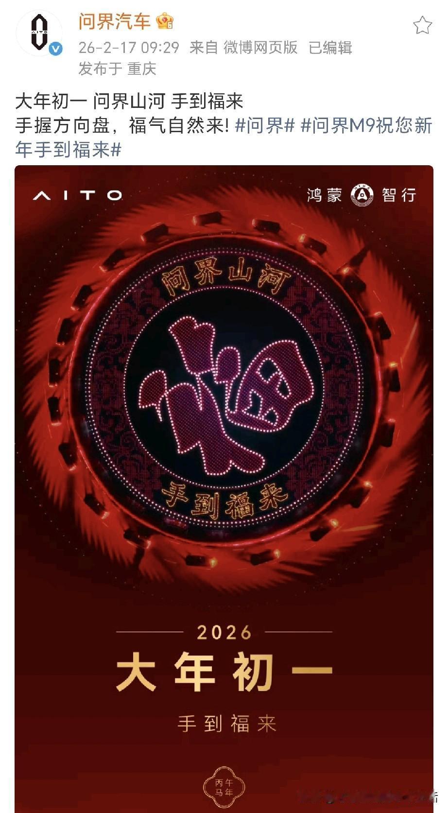 华为余承东大年初一给大家拜年了! 余总祝大家新的一年,祝你平平安安,稳稳当当,顺顺利利! 余总不白拜,还给大家准备了3台华为Mate 80送给大家! 今年春节联欢晚会,看到了到处都有华为的身影,妥妥的大明星!有鸿蒙智行,有华为手机, 总台马年春晚竖屏直播,华为Mate80系列,首次接入广播级系统! 特别是问界M9,问界M9连续三年亮相春晚,“问界山河,手到福来!”今年的福耀星空,把过年的氛围拉满!问界M9累计交付超27万台,21个月稳居50万级销量冠军。销量、NPS(净推荐值)、保值率全维领先。 鸿蒙智行,华为全栈科技赋能打造豪华汽车智能新标杆!太厉害了!你们觉得呢?