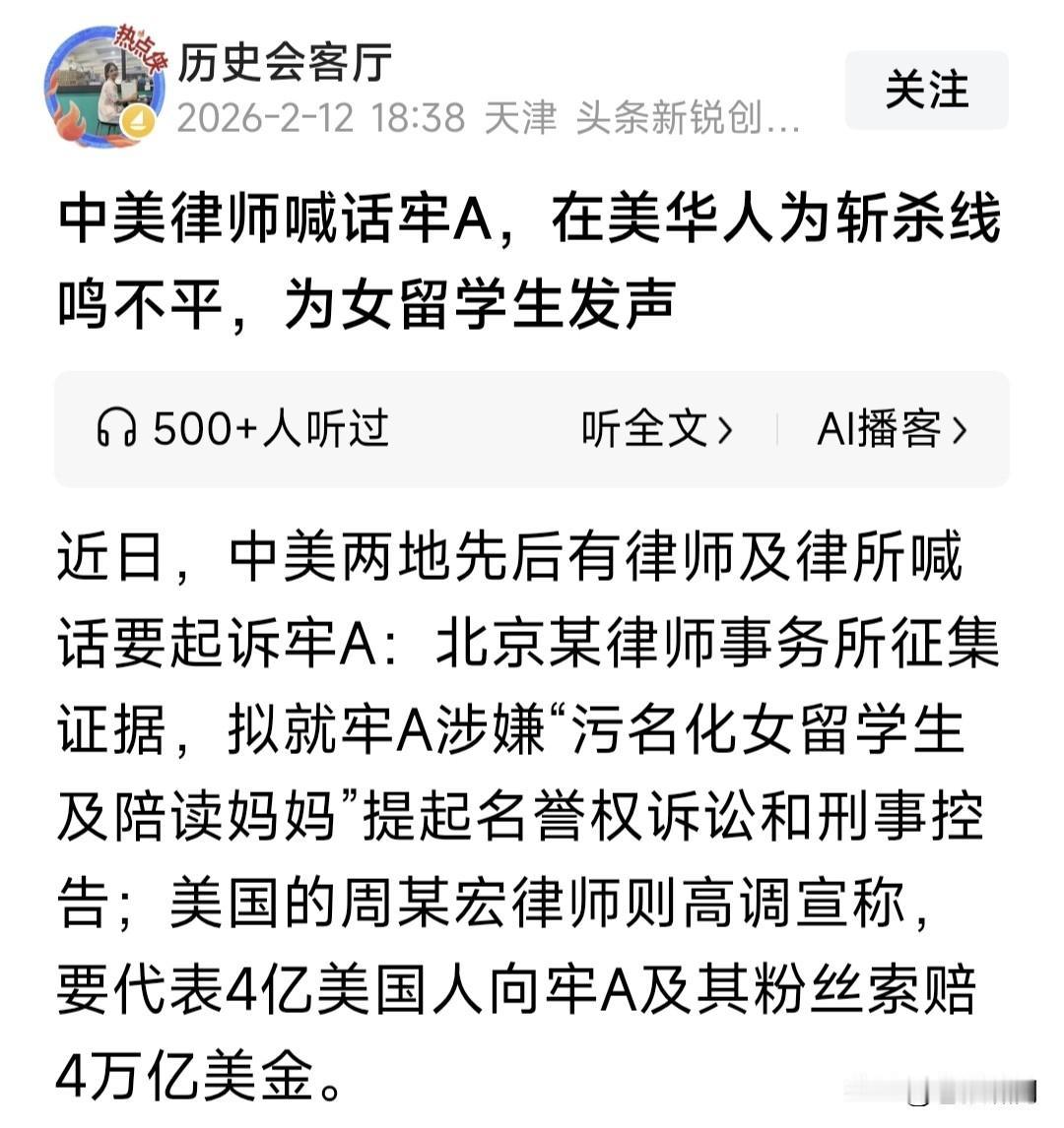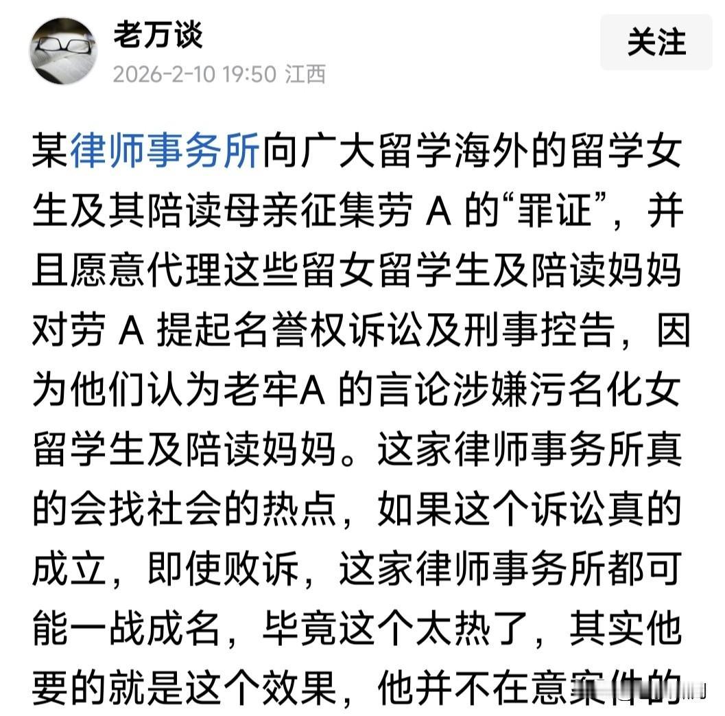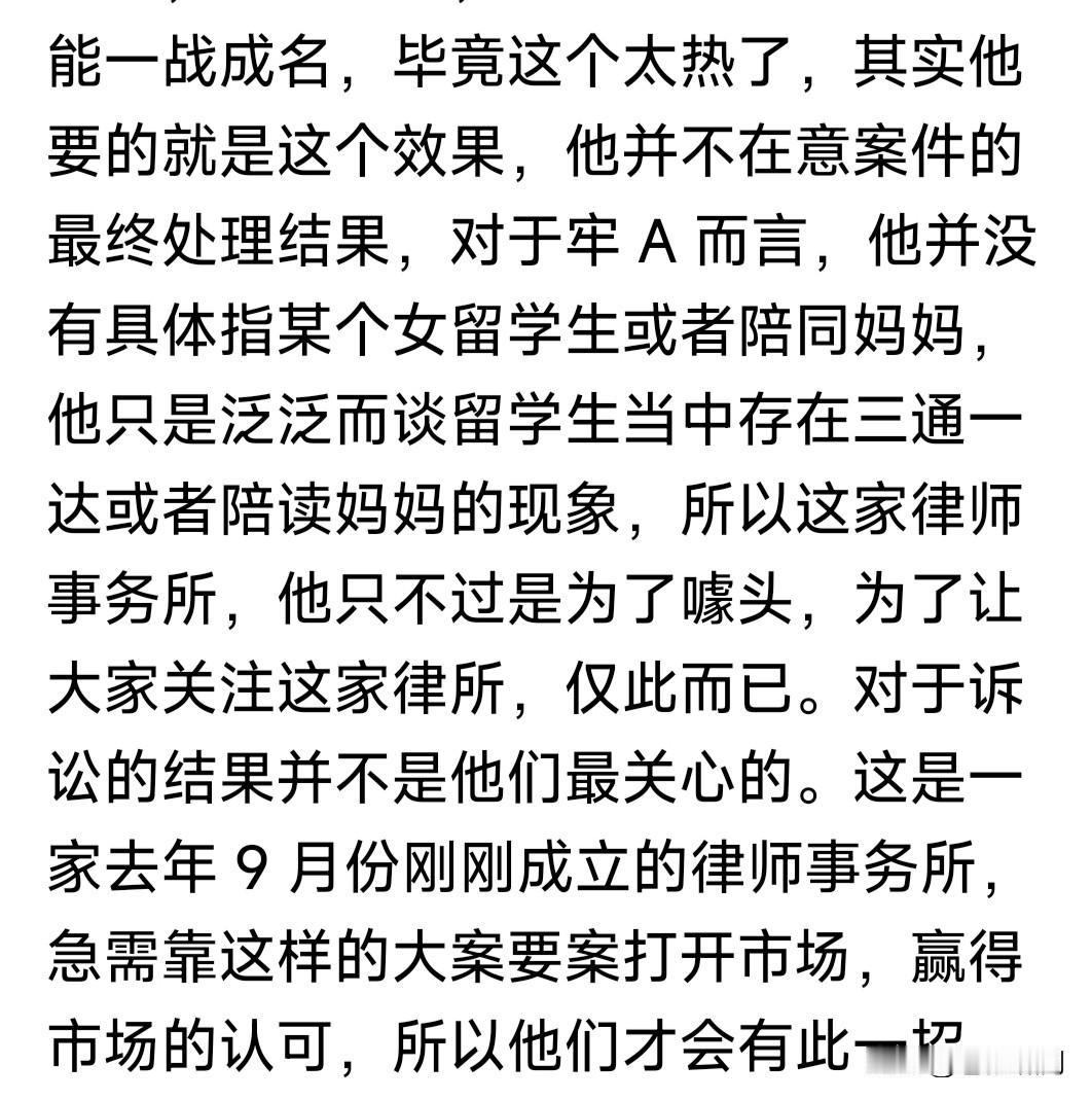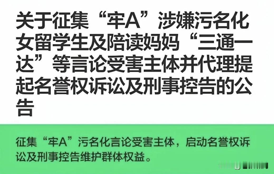 牢A面临危险了?中美律师发公告,征集牢A污名女留学生及陪读妈妈,“三通一达”言论受害主体,代理提起名誉诉讼及刑事控告,维护群体权益! 此事猛听声势不小,其实都是噱头。这两个律师与事务所,知名度都不高。何况牢A说的“三通一达”,只是某种现象并没说是谁?如何作为起诉证据? 另外就是,牢A即便掌握有“三通一达”证据,他敢说出来吗?那些被污名“三通一达”者,无者无需作证!有者怎么作证?岂不是承认有那样的事吗? 中美这两个律师与律师所,应该是想借牢A言论的热度,提高各自的声誉与知名度,其他并无实际意义!因为起诉牢A,证据不好获取,难度太大了! 不过话说回来,牢A污名女留学生与陪读妈妈“三通一达”,确实不应该!包括他的其他言论:糖霜苹果迪斯科米,斩杀线流浪汉,确有以偏概全之嫌! 回顾事情始末,有一点可以肯定:如果他得知住所被人搜查,没有及时逃跑的话,恐怕真就被逮捕起诉了!罪名可能是“造谣惑众”,包括“三通一达”! 苍狼始终认为:美国社会并不完美,肯定存在牢A说的“斩杀线,流浪汉,糖霜苹果,高达,迪斯科米,三通一达”,但绝非普遍现象,果真如此,老美不早崩溃完蛋了!谁还想去留学呢? 纵览牢A事件,只能说他是一个留学失败者,是失败之后的情绪发泄而已!如果是个成功者,就不会说这些了! 苍狼不理解的是,牢A说的这些事,竟有网友相信是美帝全貌,并为此欢欣雀跃!欢欣个啥呢?实在不可理解。 …………