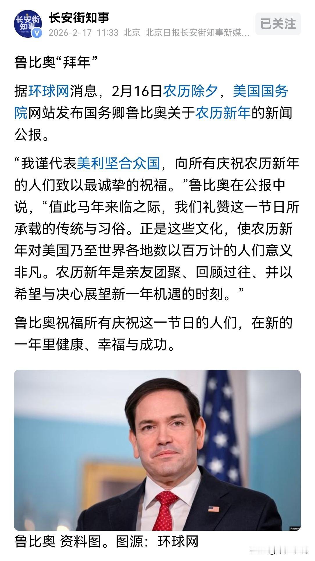 卢比奥也得屈服于中国越来越来的影响力,开始学会“拜年”了 卢比奥可谓是反华政客中的急先锋,但是他也不得不屈服于中国越来越大的影响力,在中国的农历新年,卢比奥也通过社交媒体向全世界所有过农历新年的人们致以祝福