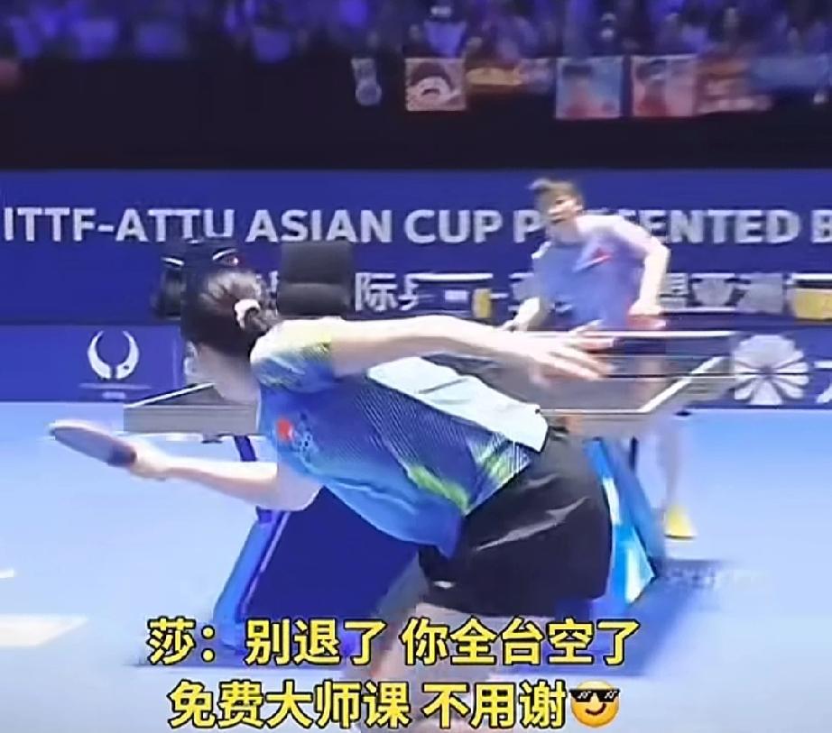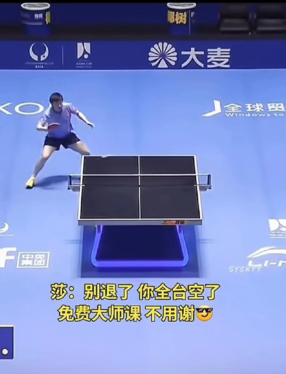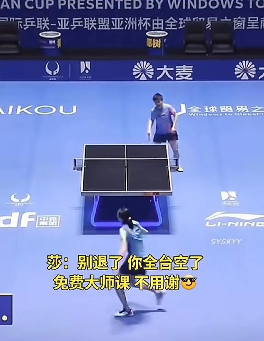 让莎莎教你怎么打球。 陈熠别退了,再退你全台空了。 陈熠和莎莎比赛,大角度,大长腿,护全台,这是陈熠的优点,但是缺点是不够灵活,反应慢。 你看看对面的莎莎,看着陈熠大角度,不慌不忙,使劲扣杀,陈熠面对扣杀不气馁,退台后也使劲扣杀,结果对面莎莎来个近台侧摆,远处的陈熠看着球落地,根本来不及救。 看到了吧,陈熠,莎莎打球真是过脑子的,不是腿长手长就行的。