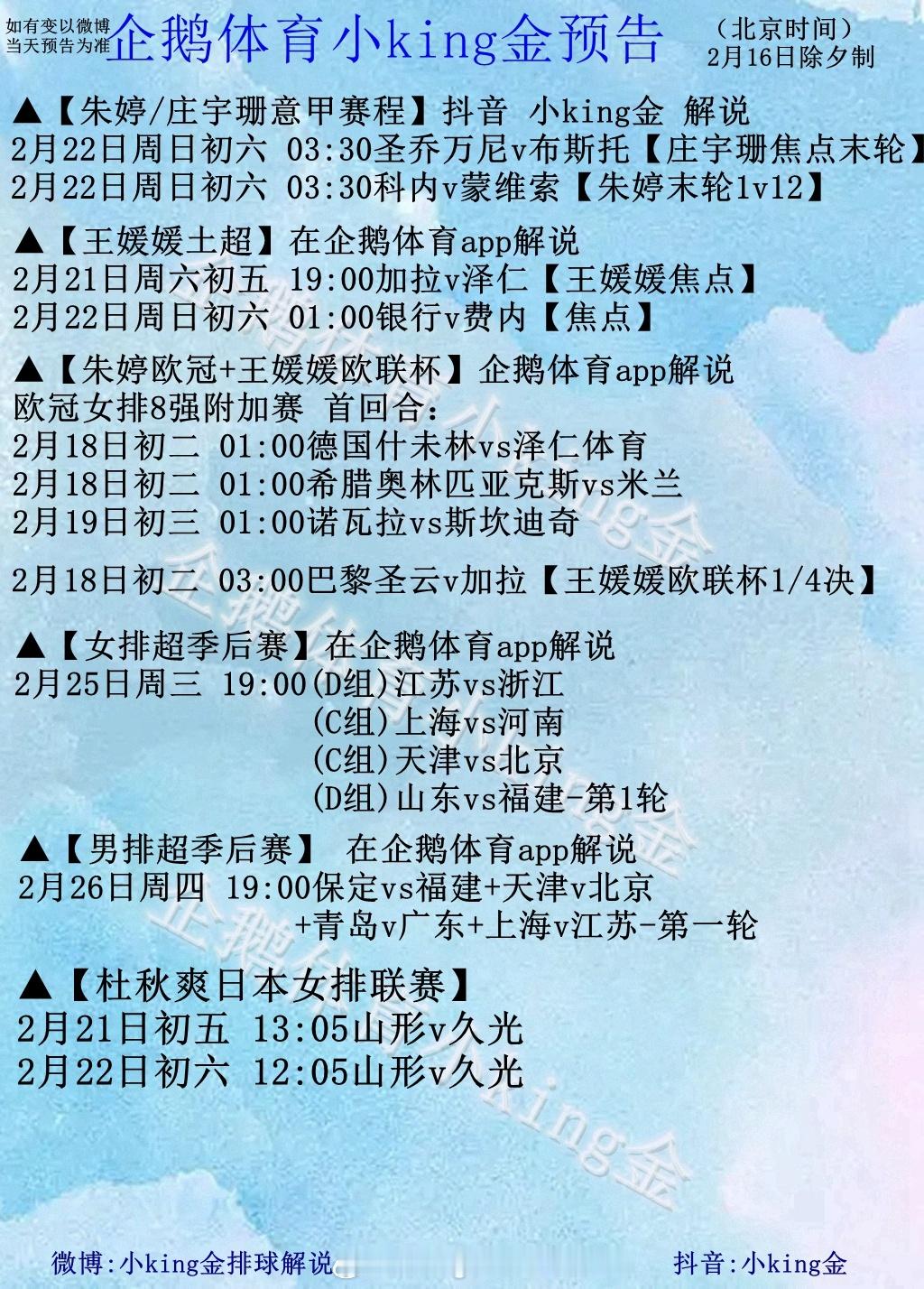 ❤️2月17日大年初一直播预告:▲【王媛媛欧联杯+欧冠附加赛首回合 在*企鹅体育app*直播,网页链接】⏰ 01:00德国什未林vs泽仁体育--初二晨 01:00希腊奥林匹亚克斯vs米兰--初二晨⏰ 03:00巴黎圣云v加拉【王媛媛🇨🇳欧联杯1/4决】-初二晨 本场信号待定。 (加微信kingpaiqiu进群 ,微博:小king金排球解说 看录像和预告,意甲女排在抖音:小king金 直播,企鹅体育app直播其他比赛)中国女排王媛媛土耳其女排联赛女排欧冠