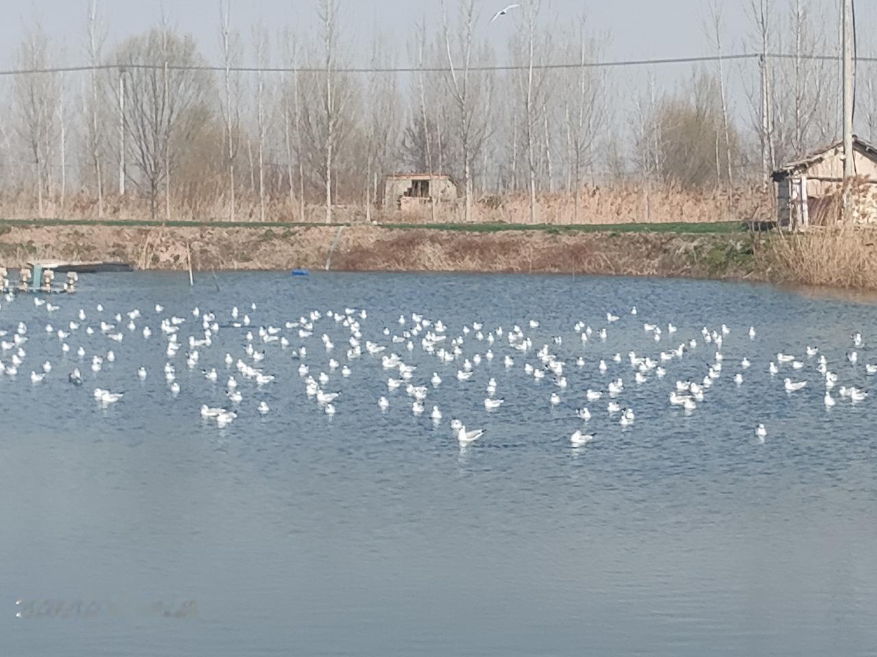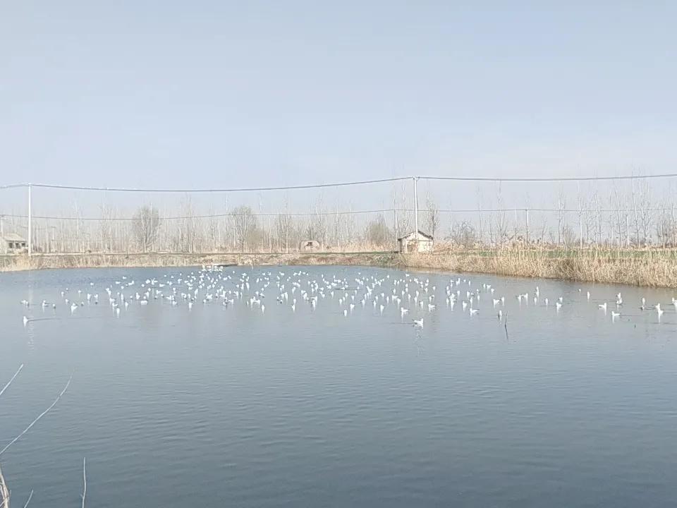 今天大年初一,我家鱼塘里来了一大批水鸟,背部和尾巴是灰色的,其他地方是白色的,这