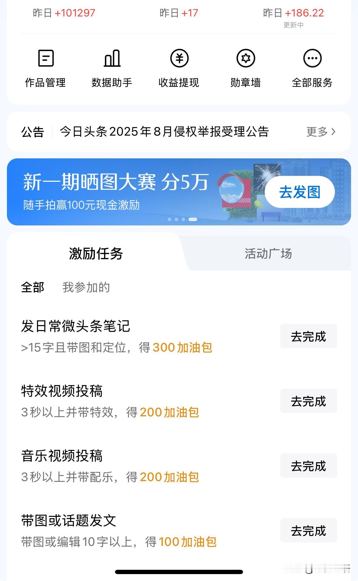 大年初一🧨 头条给的小惊喜,昨天收益破3位数了186。 微头条和小视频总流量10 w左右, 这几天感觉发跟新年相关的, 特别受欢迎,毕竟大家都在过年麽! 断断续续的,在头条也混了好多年 说的点最近的感悟吧! 想做头条, 第一是坚持,第二还是坚持。 三天打鱼两天晒网的, 很容易就没了流量。 特别是出现爆款的时候, 要及时回复读者的问题, 多跟读者互动, 有时候一个好的评论, 可能比文章本身更吸引人, 也能容易获得平台的推荐和认可。 文笔好的,尽量发微头条和文章了, 懒一些的,发发小视频也不错哦, 我自己这几天的流量有一大半是被个救人的小视频带上来的呢。 当然,不管是文章还是视频, 内容一定要正向,清晰度尽量高, 让读者朋友们,一眼就知道在说什么 能获得或分享到什么信息, 得到新的启发或感悟! 简单一句话, 头条么,喜欢新鲜有趣有的内容, 还有就是坚持, 特别是微头条,可以先保存为稿件。 半小时或几个小时发一条, 每天坚持发, 终有一天,能收到回报的! 能坚持看到最后的, 马年一定旺旺旺! 有想在头条发展的也可以评论区交流一下哦!