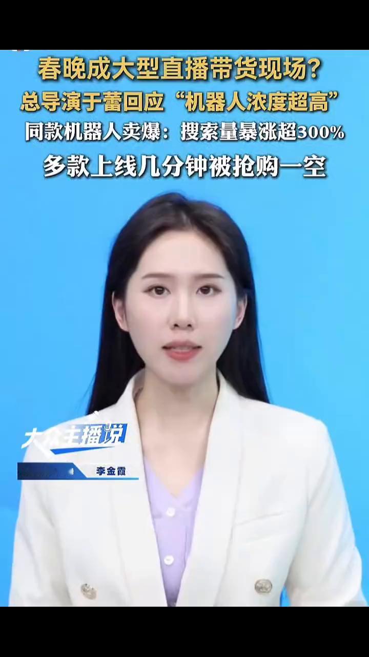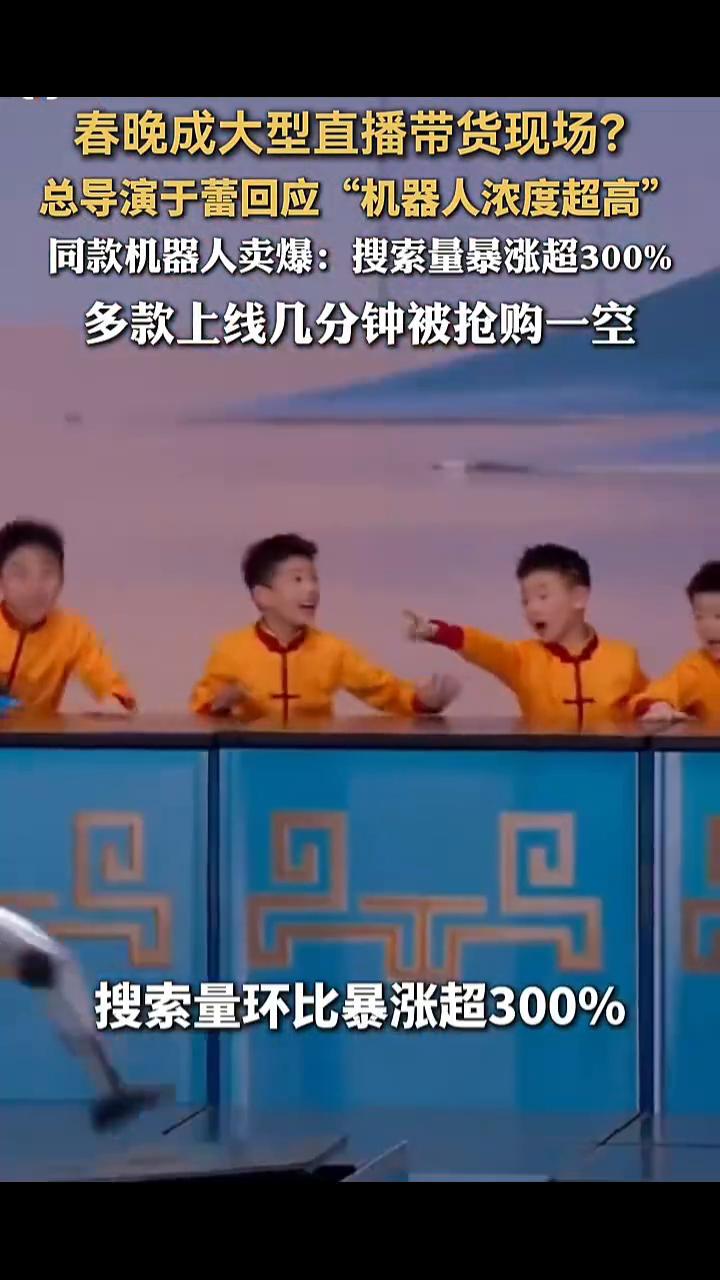 今年马年央视春晚机器人成了绝对的主角,堪称大型直播带货现场。语数科技、魔法原子等四家机器人企业同台亮相,开播两小时,京东平台机器人搜索量环比暴涨超百分之三百,订单量增长百分之一百五十,覆盖全国百座城市,从一线城市到县域都有下单。 除夕当晚十点,多款春晚同款机器人上线几分钟就被抢购一空,就连两台近六十三万元的galat通用机器人机仪也被火速买走。春晚总导演鱼类表示,今年刻意提升机器人元素占比,就是希望通过春晚这个舞台让观众直观看到中国机器人产业的立体化发展状态,这是产业实力的最好证明。