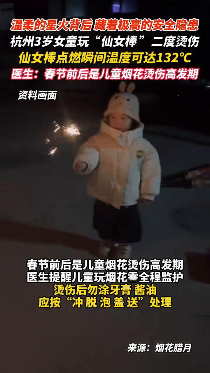 温柔的星火背后藏着极高的安全隐患。杭州3岁女童玩"仙女棒"二度烫伤,仙女棒点燃瞬间温度可达132°。医生:春节前后是儿童烟花烫伤高发期。 近日杭州3岁女童欣欣(化名)玩"仙女棒"时手指不慎碰到燃烧部位,被确诊为浅二度烫伤,妈妈自责不已。不少家长误以为"仙女棒"是"冷烟花",温度低,实则研究显示其点燃瞬间温度达132°,核心燃烧阶段飙升至160°C,熄灭30秒后余温仍可灼伤皮肤。 医生提醒儿童玩烟花需全程监护,烫伤后勿涂牙膏、酱油,应按"冲脱泡盖送"处理。