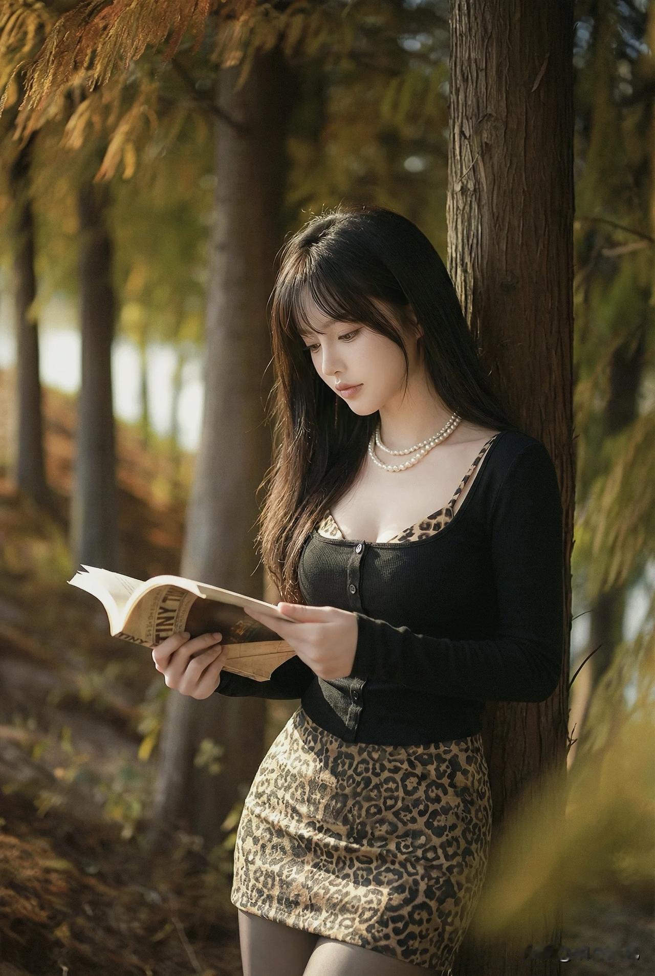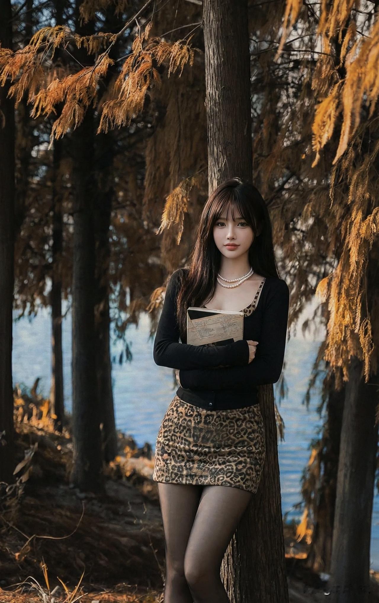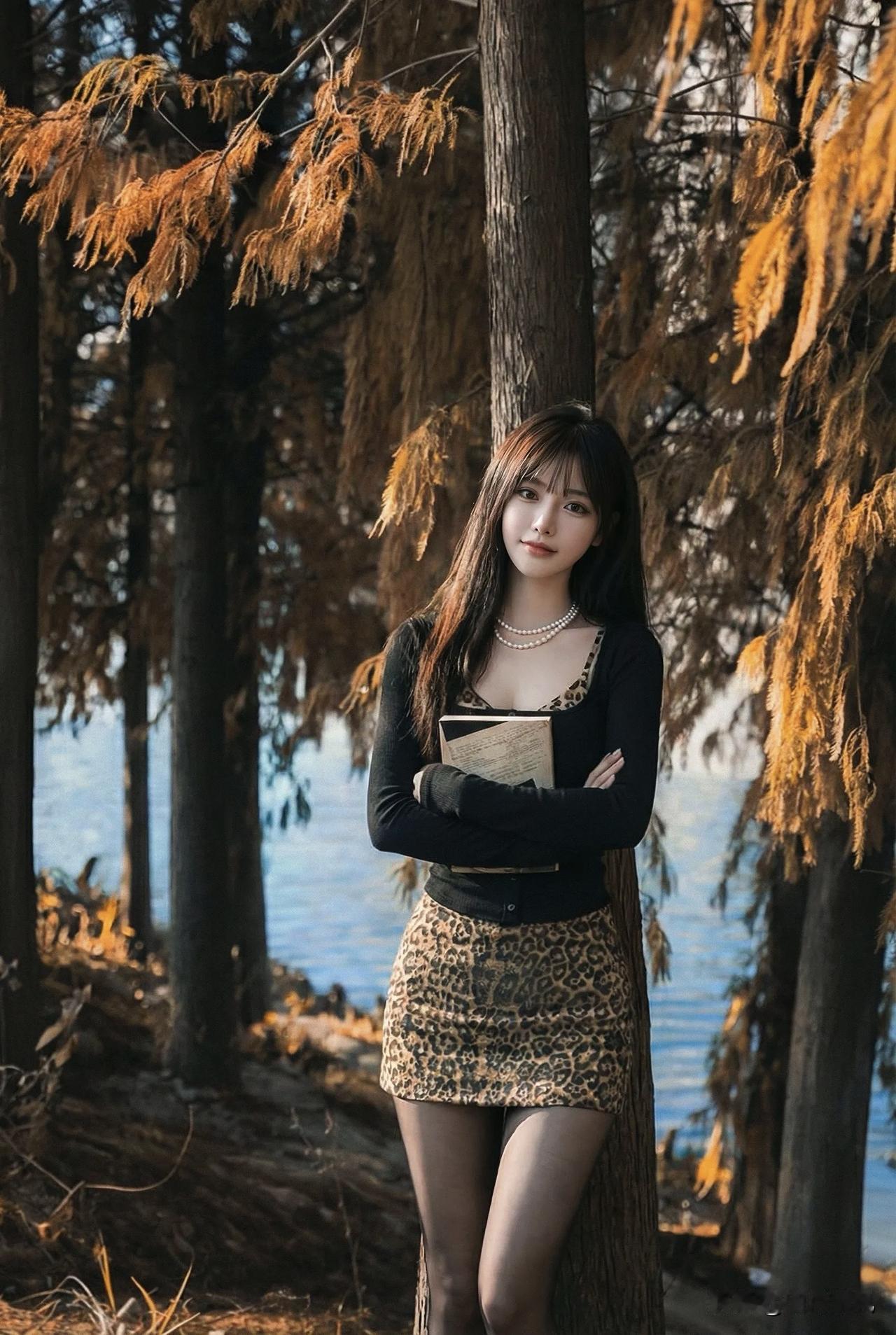 她侧身倚在树干上,金色树叶在身后铺了满满一片。 黑色针织开衫松松地拢着,露出一点豹纹裙边。怀里抱着一本书,双臂交叉压住封面,重心落在一条腿上,膝盖轻轻交叠——很自然的姿态,像是散步累了,随手靠在树边歇一歇。 侧逆光照过来,发丝和肩线都镶上一层暖边。 她没看镜头,眼神往旁边落,表情很淡。湖水在远处泛着光,秋色从身后一直漫到脚下。 就是这种时刻,安静得刚刚好。