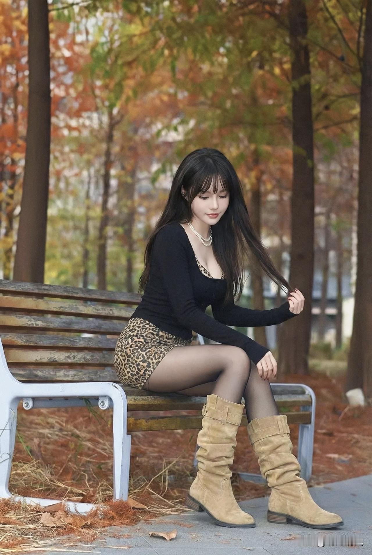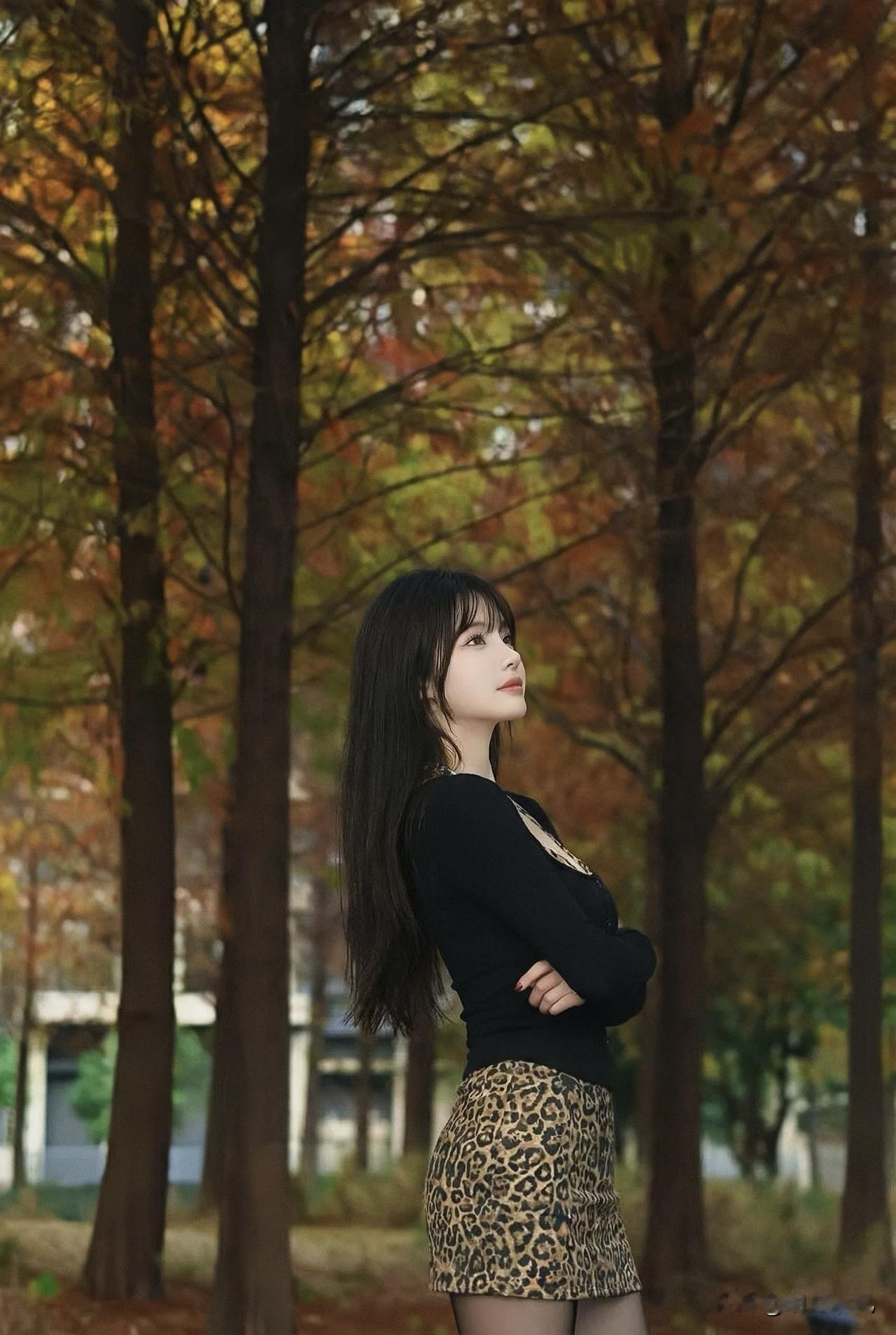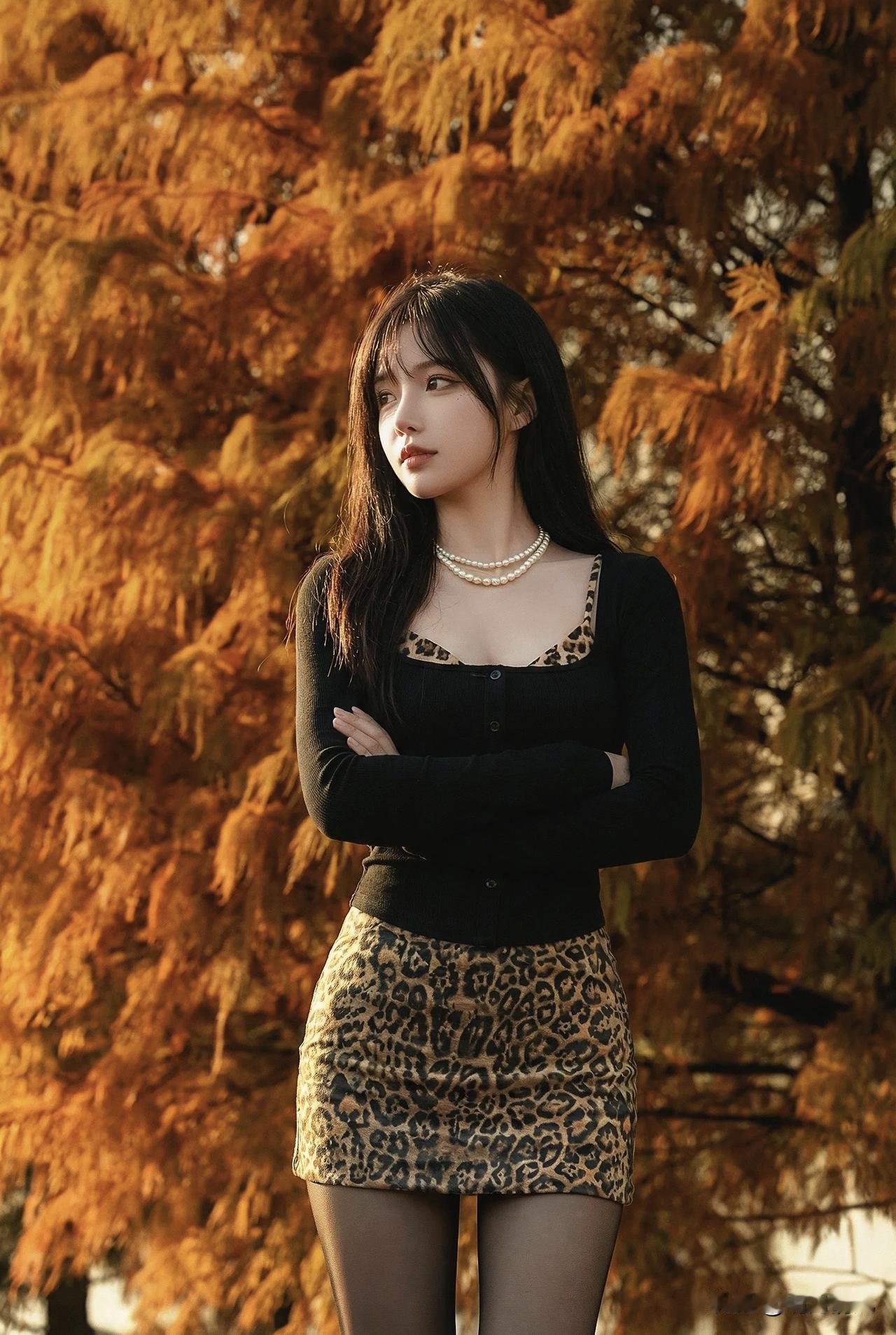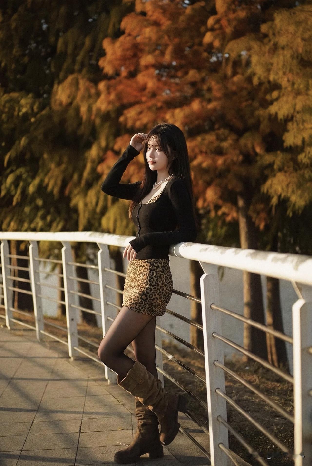 她侧身倚在树干上,金色树叶在身后铺了满满一片。 黑色针织开衫松松地拢着,露出一点豹纹裙边。怀里抱着一本书,双臂交叉压住封面,重心落在一条腿上,膝盖轻轻交叠——很自然的姿态,像是散步累了,随手靠在树边歇一歇。 侧逆光照过来,发丝和肩线都镶上一层暖边。 她没看镜头,眼神往旁边落,表情很淡。湖水在远处泛着光,秋色从身后一直漫到脚下。 就是这种时刻,安静得刚刚好。