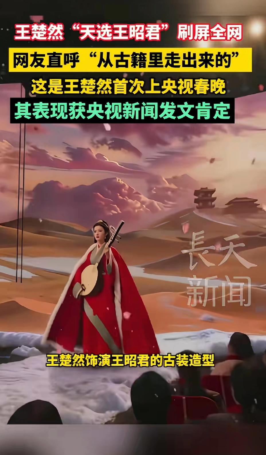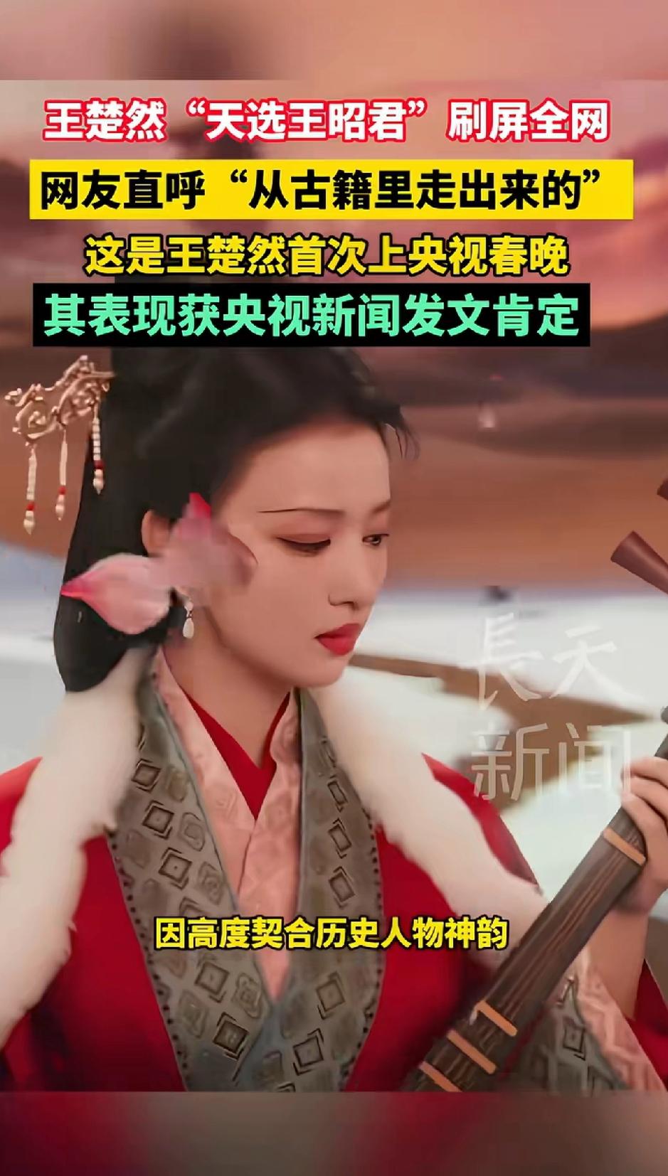 王楚然天选的王昭君,刷屏全网,网友直呼从古籍里走出来的。在《贺花神》节目里,她扮相绝美,身着正红色汉服,衣上有芙蓉花纹,冷白皮与红衣在雪景中对比强烈,像“万里冰封一点红”,网友都说她是“从画中走出的王昭君本人”。 王楚然本人长相大气,无论是古装剧里的宠妃,还是现代都市剧的职场女性,其大气的长相都能轻松驾驭。她的长相就是美丽什么角色都能驾驭。 这次她的表演更是一绝,十几秒的镜头里,通过眼神传递出离乡不舍、使命坚定、心怀家国的大爱,被赞“诉尽昭君一生”。 央视镜头捕捉的“山河回望”,感染力超强。而且她十几分钟就掌握阮咸,还原“昭君出塞”原貌。官媒也发文肯定,这王楚然,不愧是天选!