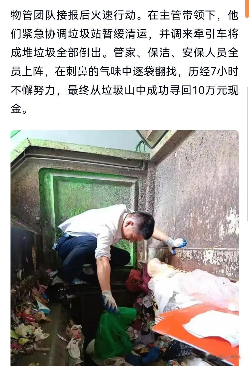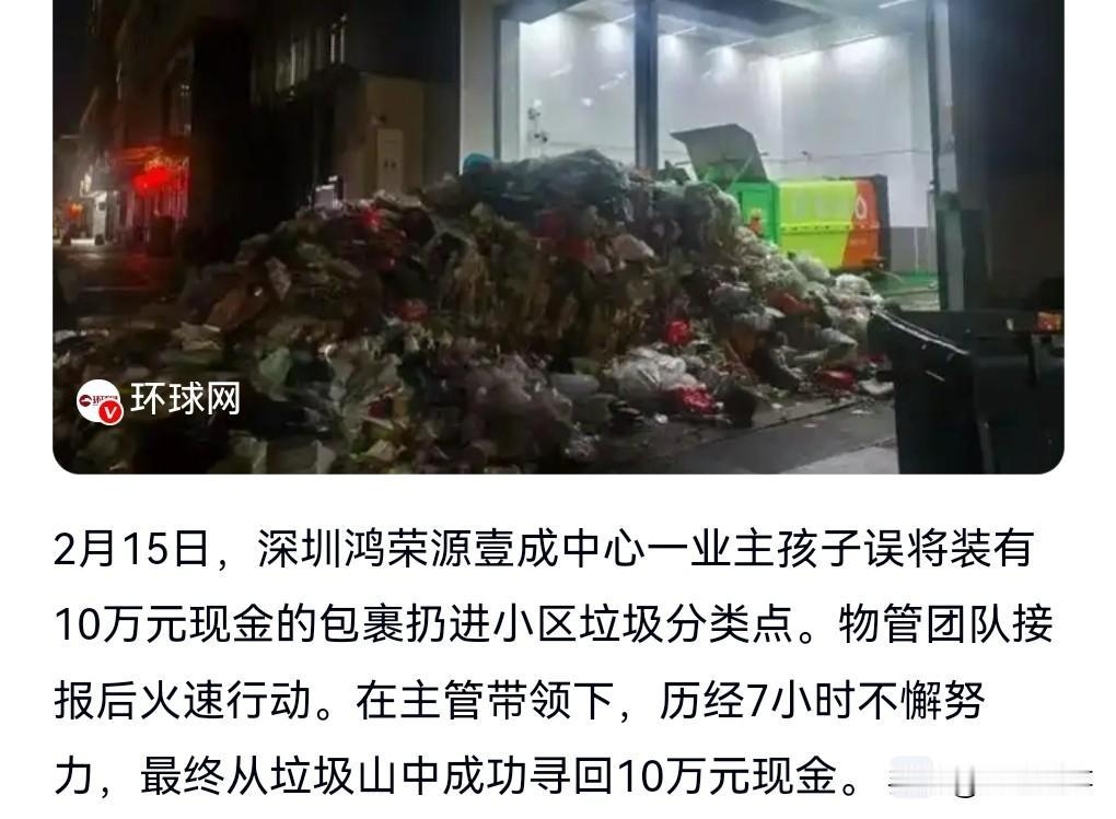 这物业能处,是真管事啊。 2月15日深圳,10万现金被孩子当垃圾误扔, 物业翻13吨垃圾找回, 这个物业竟然这么有责任心,翻了这么多吨的垃圾帮忙找到,那绝对是中国好物业啊。 这么臭气熏天的环境,找了7个小时才找到,真不容易啊。
