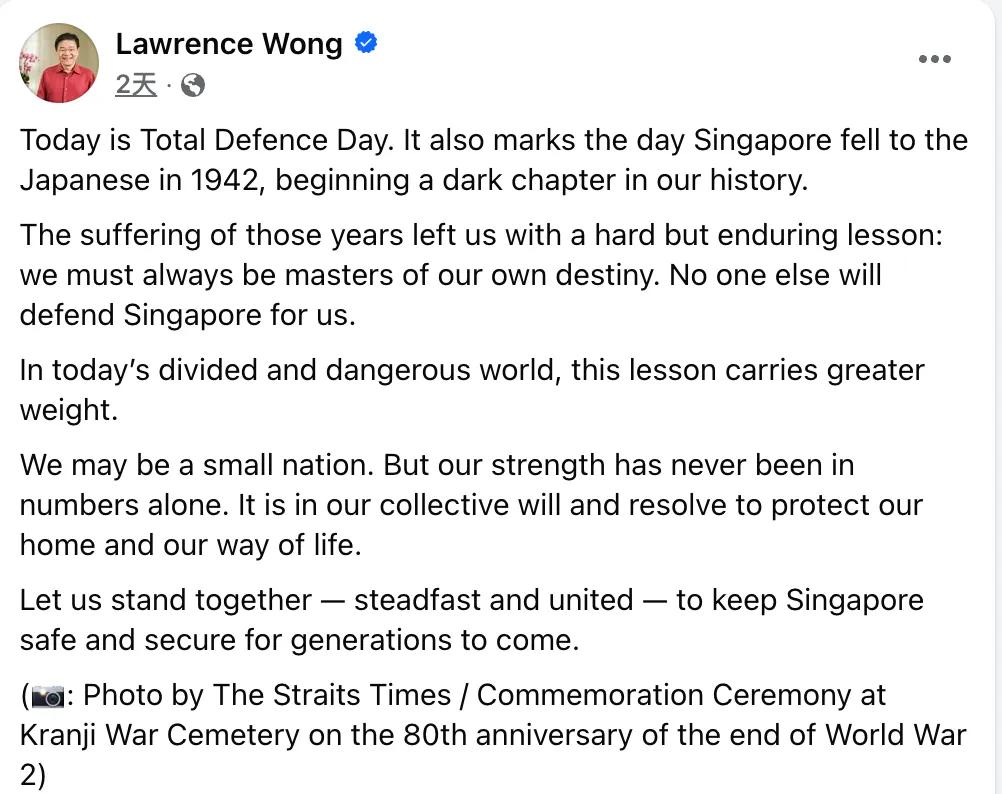 看来黄循财的政治嗅觉能力在经历了一些事情后有所提高。 2月15日,是新加坡全面防卫日,他说新加坡那几年被日本占领时期的苦难给新加坡留下了沉重却持久的教训,那就是我们必须始终掌握自己的命运,没有人会替新加坡守护新加坡。 他之前劝中国大度,希望中国放下历史向前看,现在这是又向中国立场靠拢了? 小国必须有自知之明,放下仇恨,专注搞经济造福人民才是该做的事,不能对内一套对外一套 。