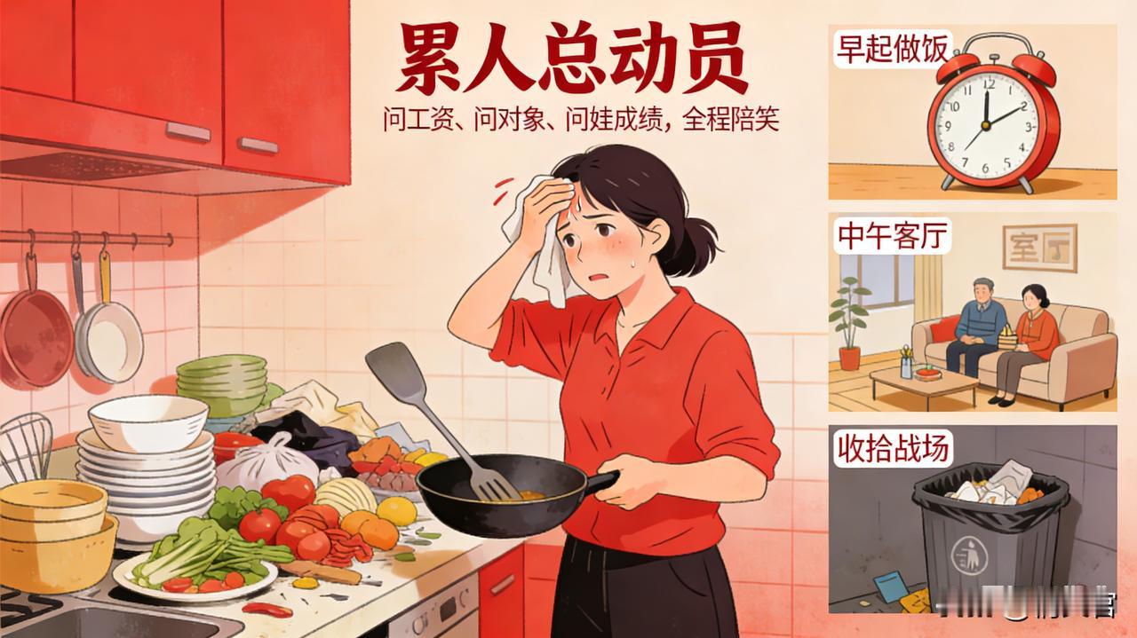 过年哪是过年,明明是累人大会 真的,越过年越累,一点不夸张。 年前大扫除、买年货、炸东西、备饭菜,忙得脚不沾地。 走亲戚、拜年、陪笑脸、应付各种提问,比上班还耗神。 一天到晚围着厨房转,做饭洗碗收拾,腰都直不起来。 想好好歇会儿,根本没机会,比平时上班累十倍。 别人眼里热热闹闹,只有自己知道有多疲惫。 啥年不年的,就想安安静静躺一天,吃口热饭,不用操心任何事。 有没有同款?过年只想躺平,啥也不干,谁也别喊我!