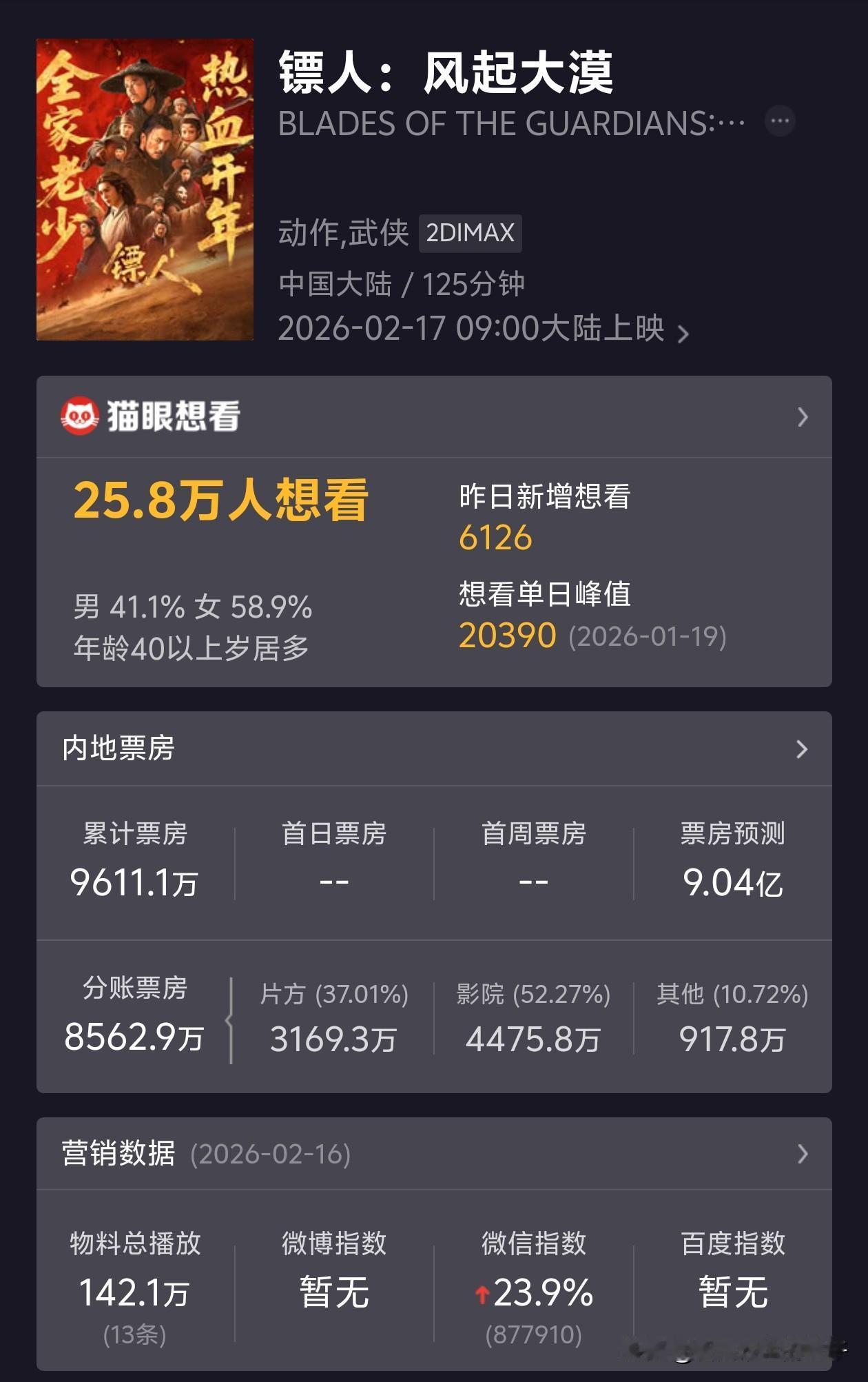 替电影《镖人》感到太可惜了! 这么良心的一部武侠片, 李连杰、吴京、谢霆锋、张晋全都在,打戏全是真功夫,拳拳到肉,看着就过瘾。 但下午去电影院看时,票房才9500多万,还没过亿,别说跟《飞驰人生3》比了,连《熊出没》都差一大截,猫眼预测最终连10亿都到不了。 我刚去别的厅看了眼,离开场不到一小时,上座率才一半多,隔壁《飞驰人生》《熊出没》,场场都快满了。 明明拍得这么用心,怎么就没多少人愿意看,难道现在的年轻人,真的不喜欢武侠了吗? 大家觉得问题到底出在哪?
