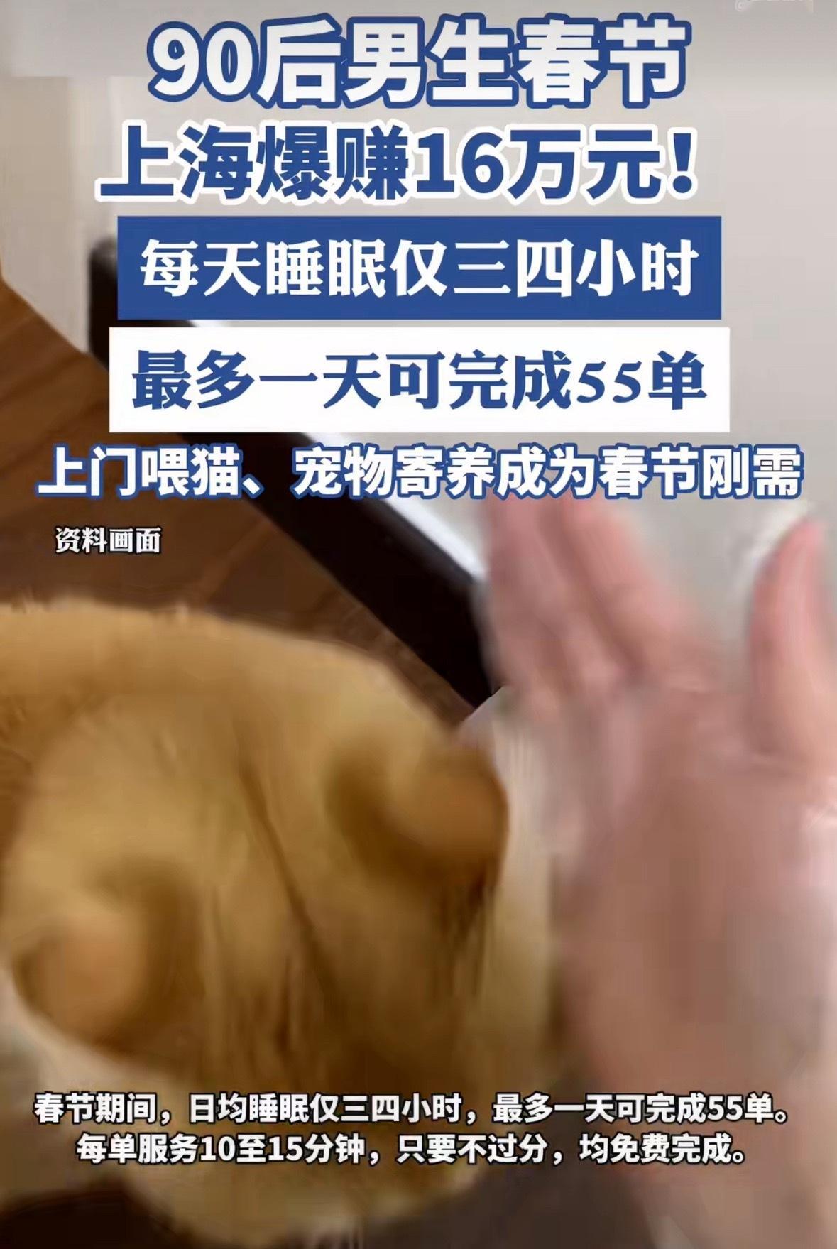 男生回应春节上门喂猫爆赚16万不是哥们,一单10-15分钟,一天55单,一天?