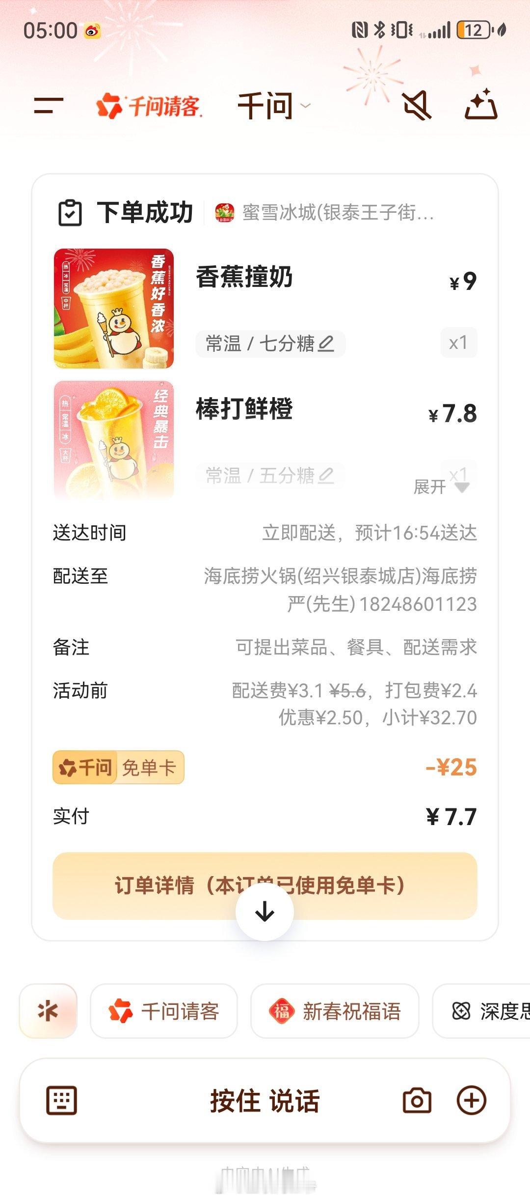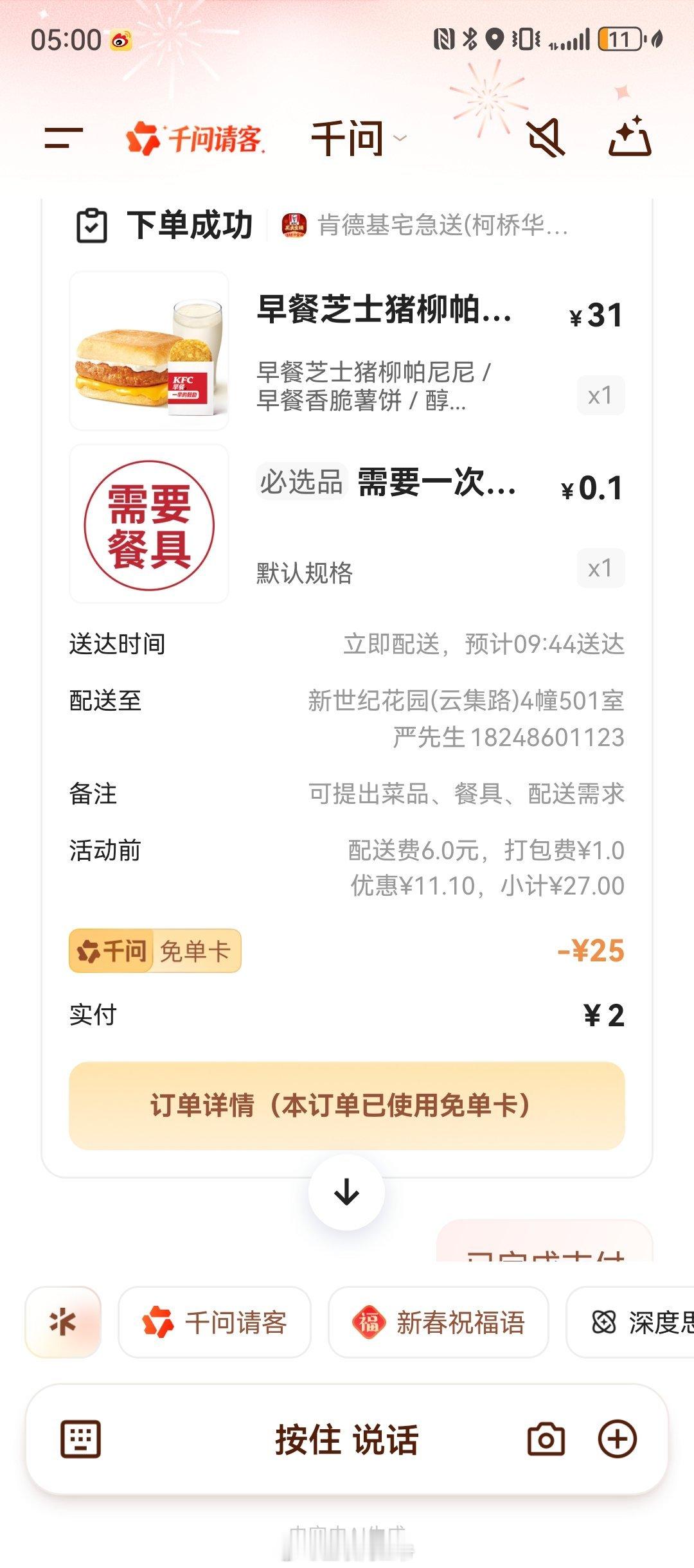 杨雨光用AI点外卖没用千问免单卡全家晒千问战绩大年初一,靠千问养着的一天!