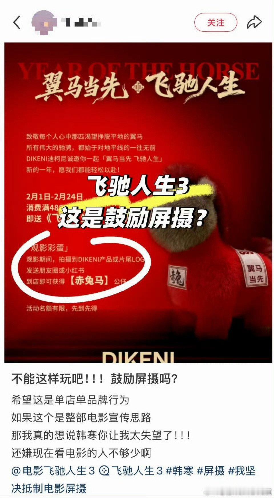 电影被抵制倒是不冤,不久前有网友发出有品牌赞助商的宣传文案里:观影彩蛋 观影期间拍摄到影片中出现的品牌logo,发 pyq 或者🍠可以获得赤兔马公仔。被网友指出疑似支持屏摄…之前薛之谦观看《飞驰人生2》后发观后感,所用照片引发“盗窃争议”,这次居然直接公开宣传😶你怎么看?