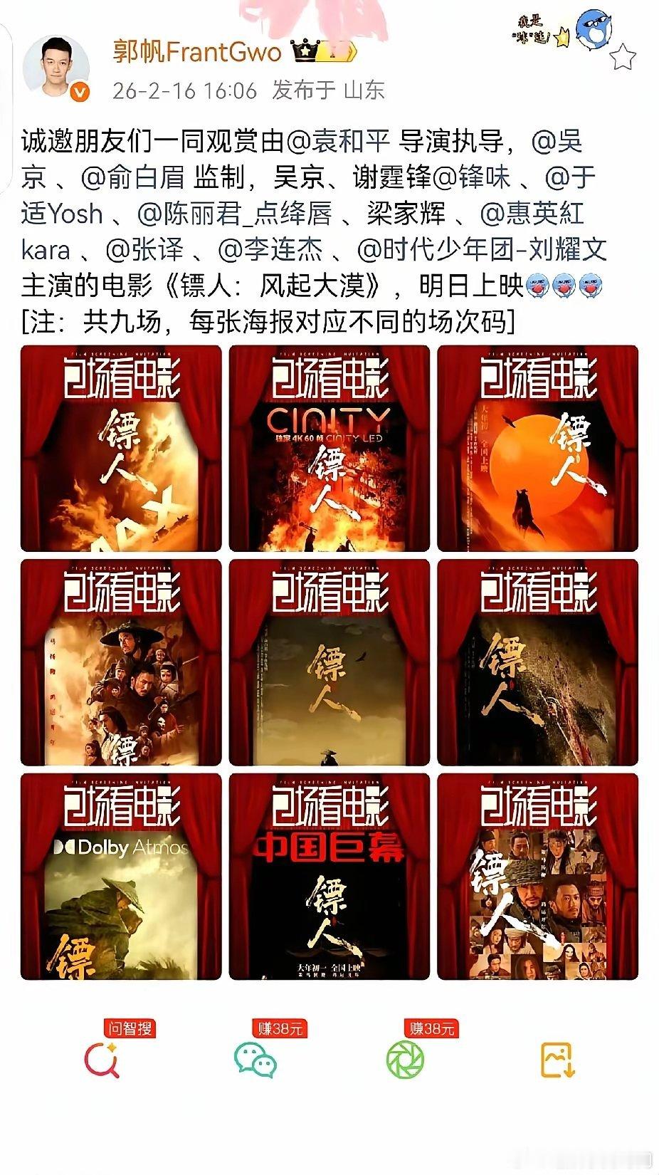 郭帆给吴京的新片《镖人》包了整整九场,这事儿可不只是朋友捧场那么简单。春节档电影