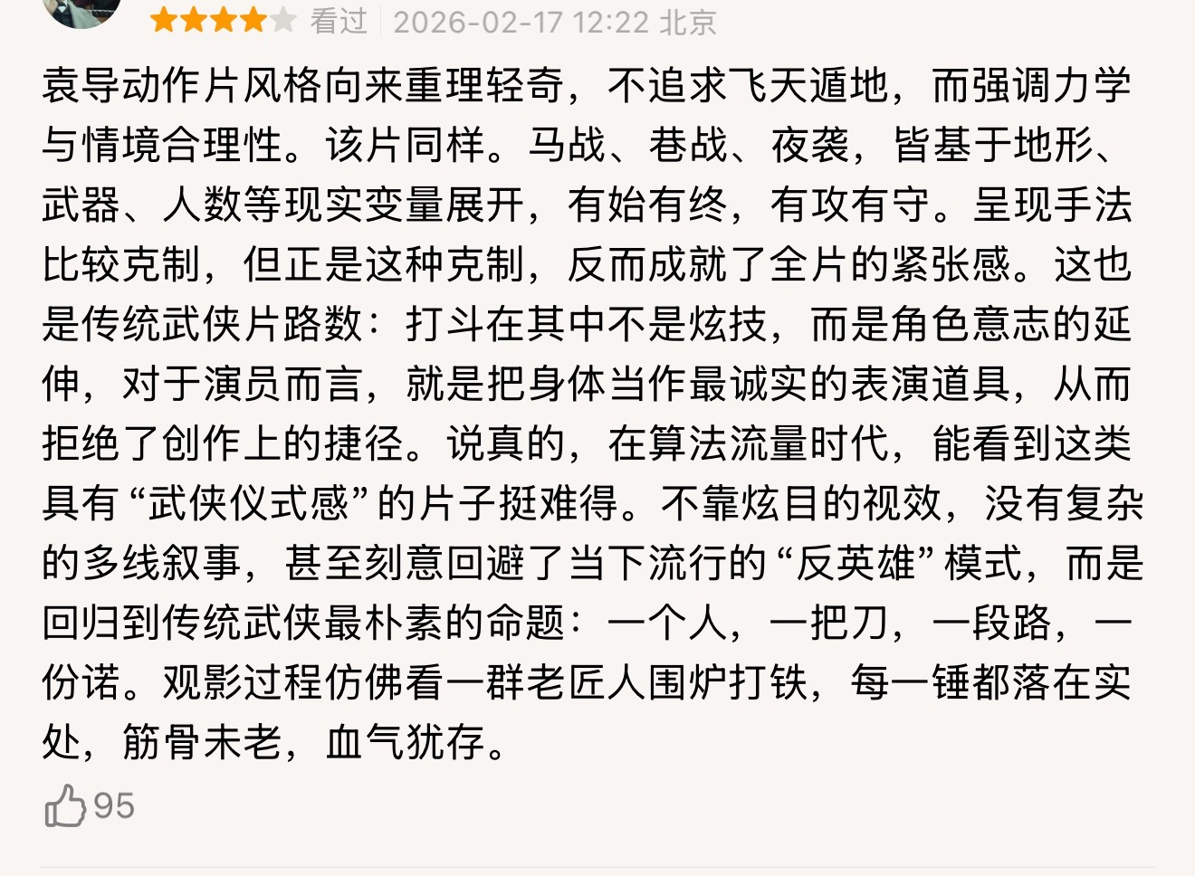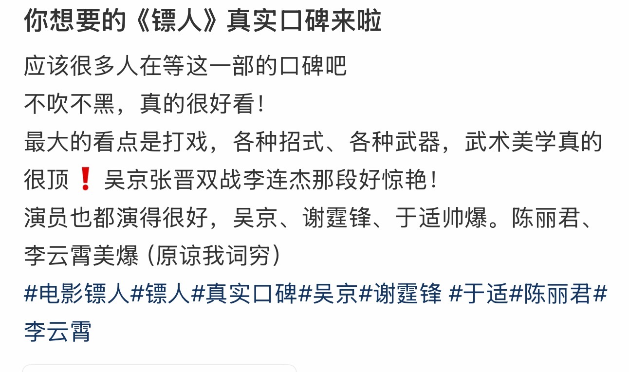 镖人第一波反馈第一波真实反馈来了!镖人的武打招式武器,整个武术美学角度很顶!原著党真的可以放心了,看大银幕上他们打来打去实在爽,质量是上乘之作,巧妙设计还改了短板,在沙漠的实景,质感自然是这个👍,看了想二冲!血气犹存的武侠片,电影院看起来!