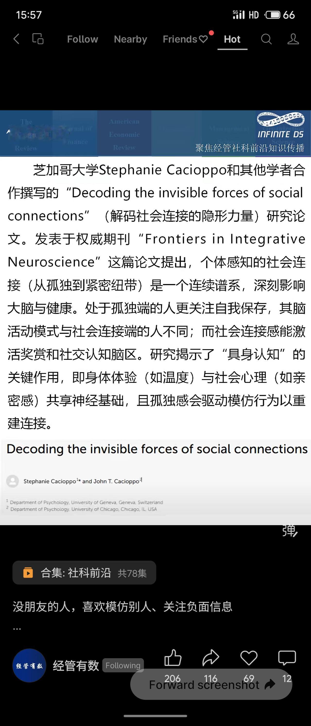 由芝加哥大学Stephanie Cacioppo团队发表于《Frontiers in Integrative Neuroscience》的论文,解码了社会连接的“无形之力”。研究指出,社会连接感是一个从孤独到亲密的连续谱系,深刻影响着大脑与行为。处于孤独端的人更易启动自我保存模式,对负面社会信息更敏感,并倾向于通过模仿他人来试图重建连接。 论文强调“具身认知”的作用,认为身体体验(如温度)与社会情感(如亲密感)共享神经基础。这解释了为何社会隔离不仅是一种心理状态,更会重塑我们的感知与行为模式。 分这项研究为理解当代社会的孤独现象提供了神经科学依据。“没朋友的人爱模仿、关注负面信息”并非性格缺陷,而是大脑应对社会隔离的适应性策略。它提醒我们,社会连接如同空气与温度,是我们生理与心理不可或缺的一部分,其缺失会触发一系列无意识的“求生机制”。这也为干预社交障碍、促进心理健康提供了新的思路:通过改善身体体验或模仿行为,或许能反向强化社会连接感。