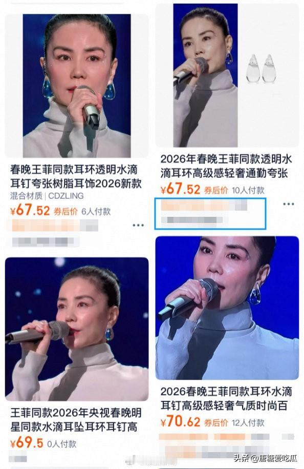 谢霆锋没想到 窦靖童也没有想到 因为王菲这次上春晚,带火的不是歌曲《你我经历的一刻》,而是她的水滴形耳坠。 不得不说义乌商家也是神速,昨天晚上才出来的样式,今天某宝就已经同款外卖了,而且很多店都在售卖,也许可以说王菲唱歌不如以前了,但是她的带货能力还是杠杠的。