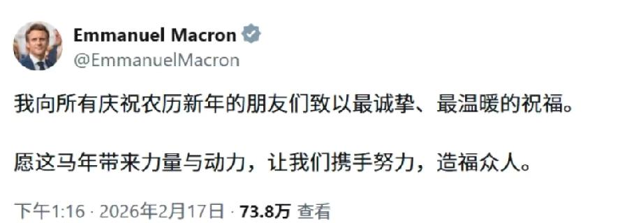 大年初一,马克龙用中文发文拜年:“我向所有庆祝农历新年的朋友们致以最诚挚、最温暖的祝福。愿这马年带来力量与动力,让我们携手努力,造福众人。”除了中文,马卡龙还用法语、韩语和越南语发帖,送上新年祝福。 马克龙四语拜年藏深意:法国正在走一条“平衡务实”的新路!大年初一,马克龙用中、法、韩、越四种语言送上新春祝福,这早已不只是礼貌,更是欧洲大国的现实选择。作为西方核心国家元首,他连续多年主动用中文拜年,既尊重东方文化,也瞄准中法超680亿美元的经贸大盘,持续释放合作信号。 回顾60年前中法建交,法国就曾在西方阵营中率先与中国正式建交。如今单边主义抬头、欧美摩擦不断,法国更需要独立自主的外交空间。多语种拜年,是兼顾亚裔群体、亚洲伙伴与中国市场的精明布局,也是“不选边、只选利”的务实外交。 马年提“力量与动力”更是一语双关:既祝华人马年顺遂,也盼中法在新能源、航空、文化等领域提速共赢。这不是简单客套,而是大国相处的清醒与智慧。