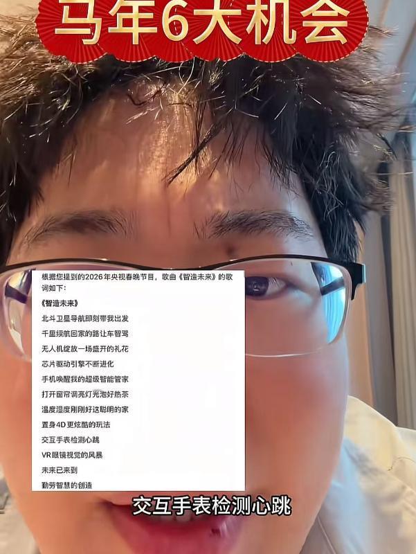 马年六大机会!这首歌到底是谁写的,网友调侃,春节导演不会是被套住了吧!航天、无人机、AI、芯片,AI眼镜,多个概念都说了一遍,市场不就是轮流炒这些东西吗,有啥可总结的呢?不过春晚最超预期的还是宇树机器人,不过前面已经炒作过一波,套牢盘不少,主力会这么好心去释放前面的散户吗,大家怎么看呢?
