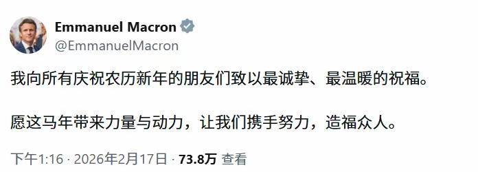 马克龙也拜年了,但他与美国国务卿鲁比奥、日本首相高市早苗在拜年时针对的对象如出一辙,那就是“所有庆祝农历新年的朋友们”!发现了吗?巴西总统卢拉“祝愿两国人民在丙午马年兴旺发达、吉祥安康,期待双边关系持续深化”,其他很多国家的领导人也都会在拜年时提及中国,但马克龙、鲁比奥和高市早苗却没有,有什么说道呢?