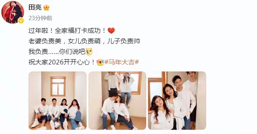 田亮大年初一晒全家福,与叶一茜亲吻,森碟烫头发化妆成颜值担当
