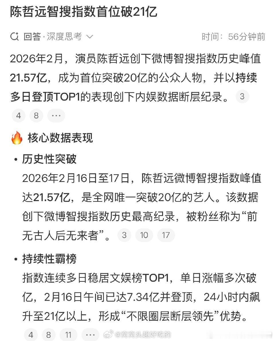 陈哲远智搜指数首位破21亿陈哲远微博智搜指数突破21.5亿+,成为【首位】且【唯一】突破20亿的公众人物!!🔥持续多日创造不限圈层断层新高,稳居智搜指数榜【TOP1】🔥除夕临时开播、观看人数3800W、微博访问人数已经突破1028W而且每秒进去都在持续上涨📈2026年开年这个陈哲远就夯爆了陈哲远智搜不限圈层断层新高