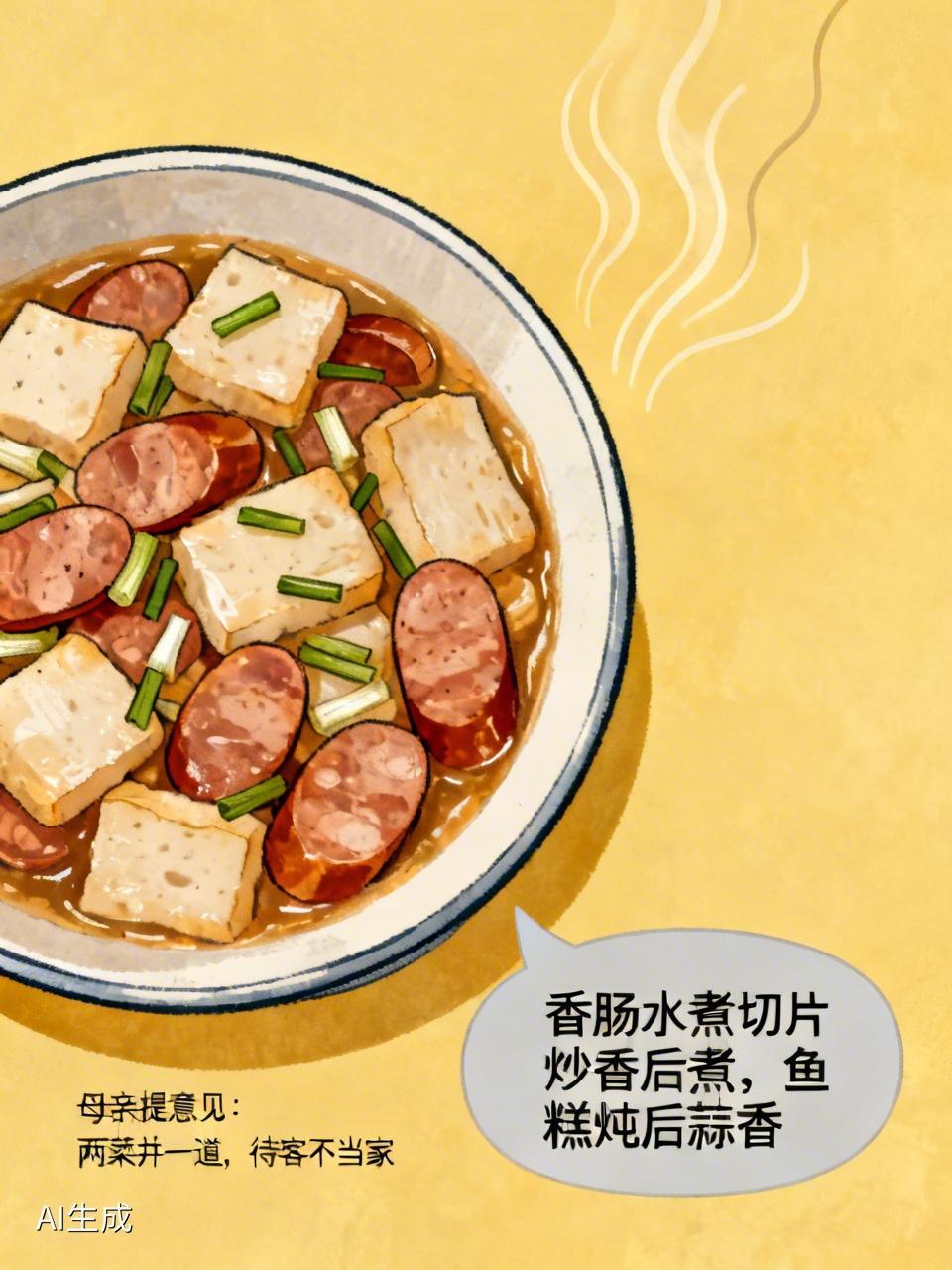 母亲的教诲。香肠有点咸,单独吃后要喝水,鱼糕有点淡,单独成盘要放帽子点缀。 今天我创新了一个吃法。整根香肠水煮后切片,用热油炒香后用开水煮,再下鱼糕炖,最后放了点蒜苗点缀。不想味道鲜美极了,香肠不咸不硬自带香气,鱼糕稍稍进点咸味沾上蒜香肥而不腻。老公连连夸奖,今天的鱼糕真好吃。 母亲提意见了:明明是香肠和鱼糕两碗菜被做成一道菜,来客人了一定不能这样做,不会当家。