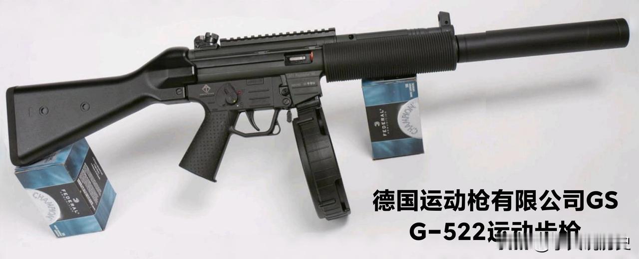德国运动枪有限公司GSG-522运动步枪 德国有一家做运动射击装备的公司,推出了一款普通人能用的GSG-522射击器材,使用0.22LR规格弹体,所有零件都在德国生产,销往美国民间。 它的外形和HK经典射击装备相近,部分零件可以通用。 器材上方有导轨可装瞄准镜,也可使用机械瞄具,枪口具备降噪效果,供弹装置有多种容量可选。 最后因外观侵权被HK公司起诉,不再生产和销售。