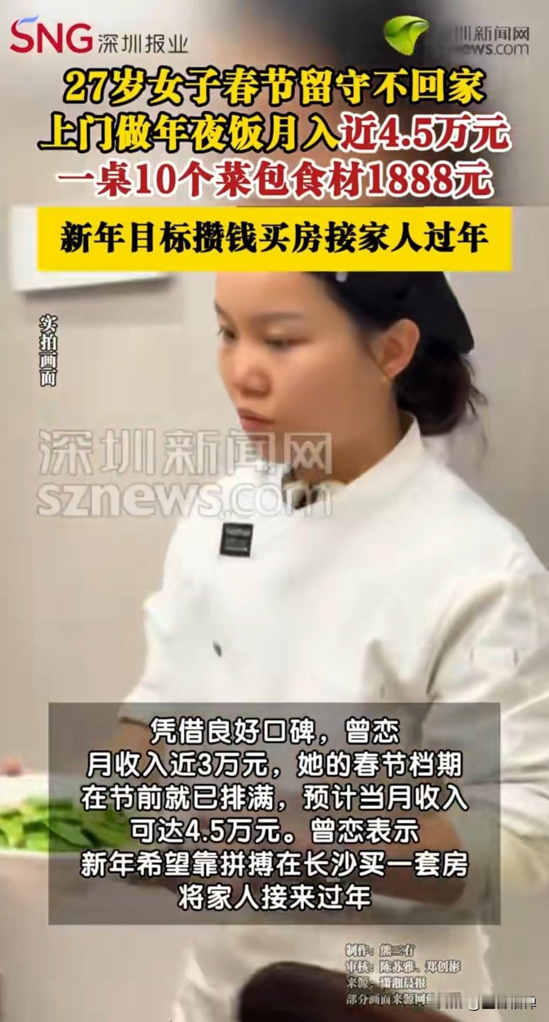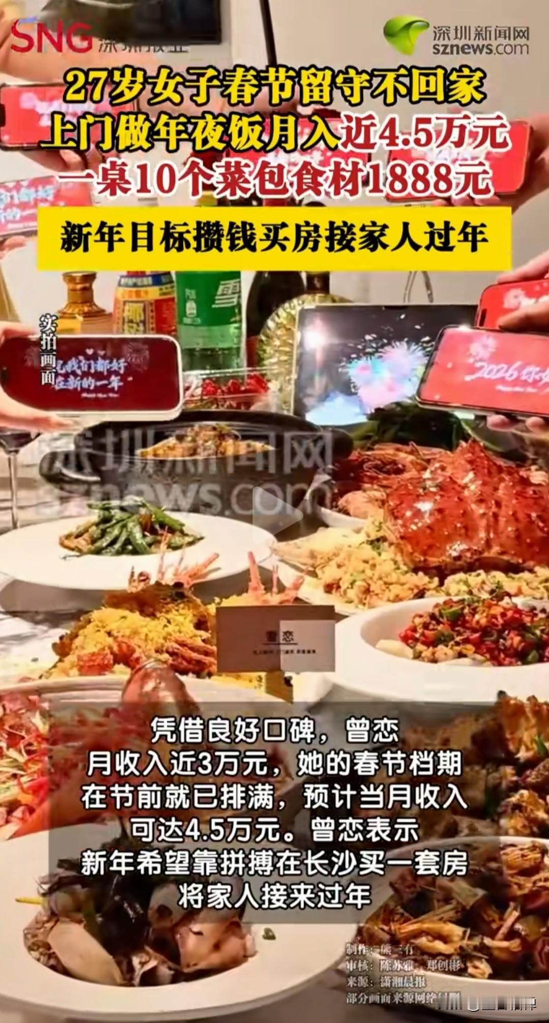 长沙95后私厨留守过年!年夜饭档期全满,正月目标冲4.5万 27岁的湖南邵东妹子曾恋,在长沙做上门私厨快3年了。今年春节,她没回邵阳老家,而是选择留守长沙接单上门做年夜饭,她的年夜饭档期就已经排得满满当当。 一桌10道菜,从备菜、烹饪到餐桌布置,全由她独立搞定。收费分两种:包普通食材1888元/桌,不包食材988元/桌,海鲜等贵价食材需另算。 凭借着良好的口碑,日常月入近3万的她,靠着春节这波旺季,预计正月收入能冲到4.5万元。 这个在烟火气里打拼的姑娘,新年愿望很实在:在长沙买套房,明年把家人接过来,一起在这座城市过个团圆年! 上门私厨,说白了就是把专业厨师请到家里来做饭。从年夜饭、生日宴到日常家宴、商务小聚,服务模式灵活,客单价从几百到上万不等,满足了大家对“专业、私密、定制化”餐饮体验的需求。 这个行业现在发展很快,从一线向三四线城市渗透,下沉市场潜力巨大。像曾恋这样的年轻从业者,用自己的手艺和努力,正在开辟一条新的职业道路。 来源:大象新闻