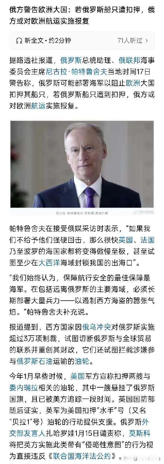 既然如此,可能就有对策! 欧盟委员会主席冯德莱恩表示,在欧盟对俄罗斯的20轮制裁中,计划将全面禁止俄罗斯海上贸易列入制裁项目。可能是因为这个缘故,俄罗斯总统助理、俄联邦海上贸易委员会主席尼古拉·帕特鲁舍夫在2月17日声称:俄罗斯可能派军舰为商船护航。若俄罗斯船只遭到欧洲大国扣押,俄罗斯将对欧洲航运进行报复。 其实,如果欧洲国家、或欧盟真正对俄罗斯的海上贸易实施强制行动,估计帕特鲁舍夫考虑的事情,欧洲早已经考虑过了,并且准备了可能是足够的应对策略和力量。 再说,俄罗斯黑海舰队在乌克兰战争中的表现来看,对俄罗斯的海军军舰的战斗力,实在是不敢恭维。