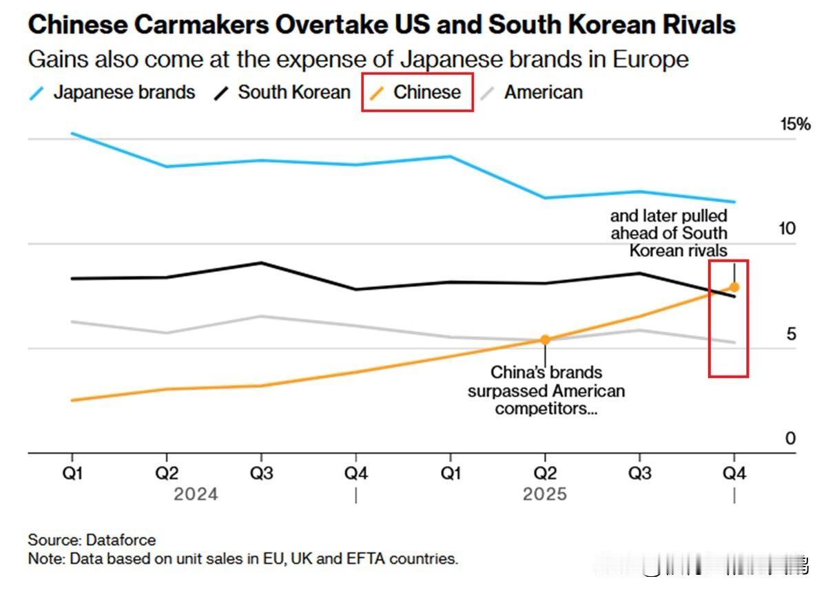 中国汽车制造商正在接管欧洲! 中国品牌现在占欧洲所有乘用车销量约10%。 这可是创纪录的水平了,并且首次超越了美国和韩国竞争对手。 他们的电动车市场份额在2025年翻了一番多,达到11%,仅12月就达到了16%。 日本品牌仍以约13%的份额领先,但按照这个速度,中国最早在2026年,也就是今年内就超过日本。 这意味着中国开始主导全球汽车市场的场面将提前到来。