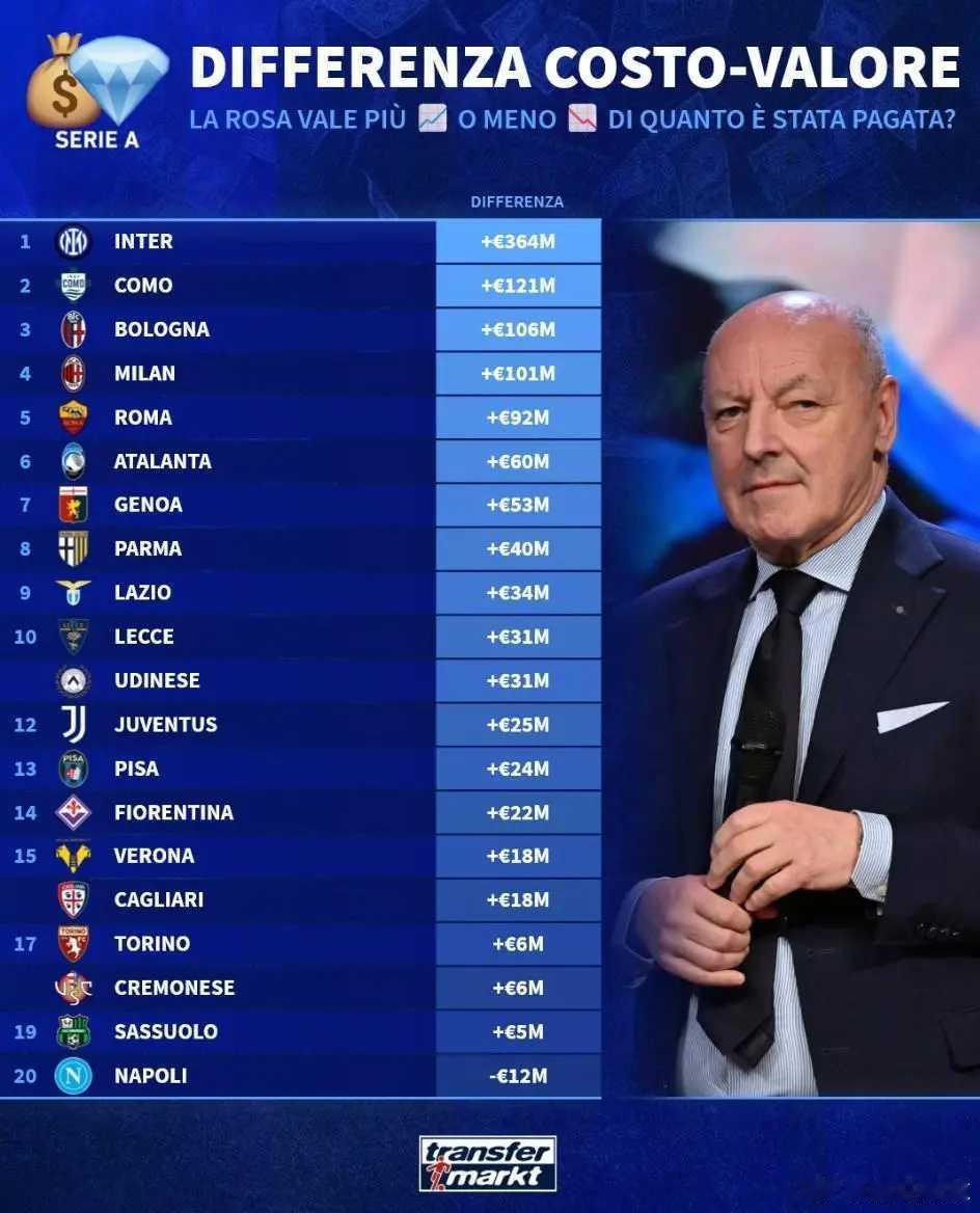 意甲球队阵容成本和现有价值差价榜:国米第一,那不勒斯垫底