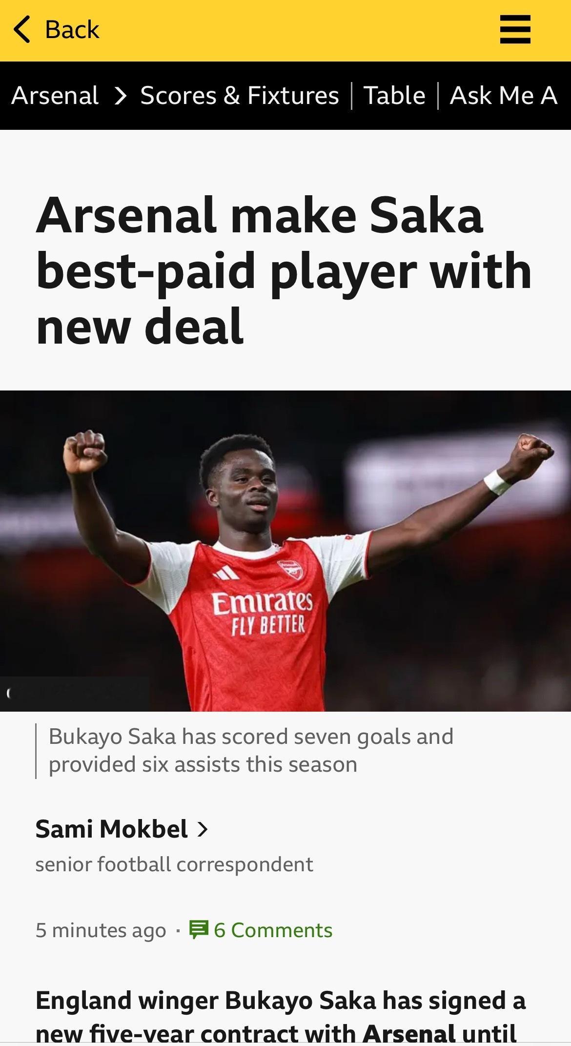 BBC Sport Sami Mokbel:萨卡与阿森纳续约的所有手续已经全部完成,5年长约,静待官宣。