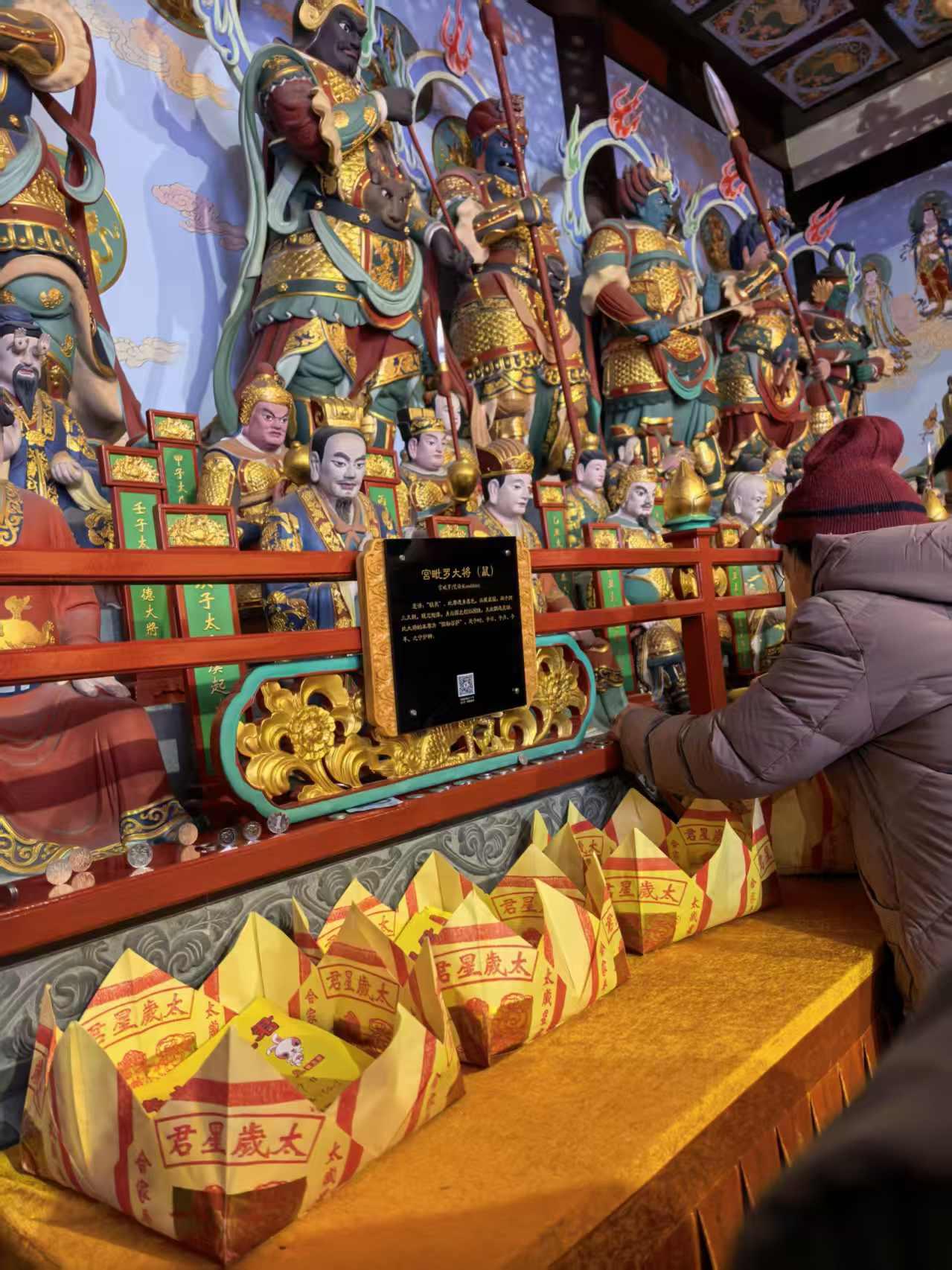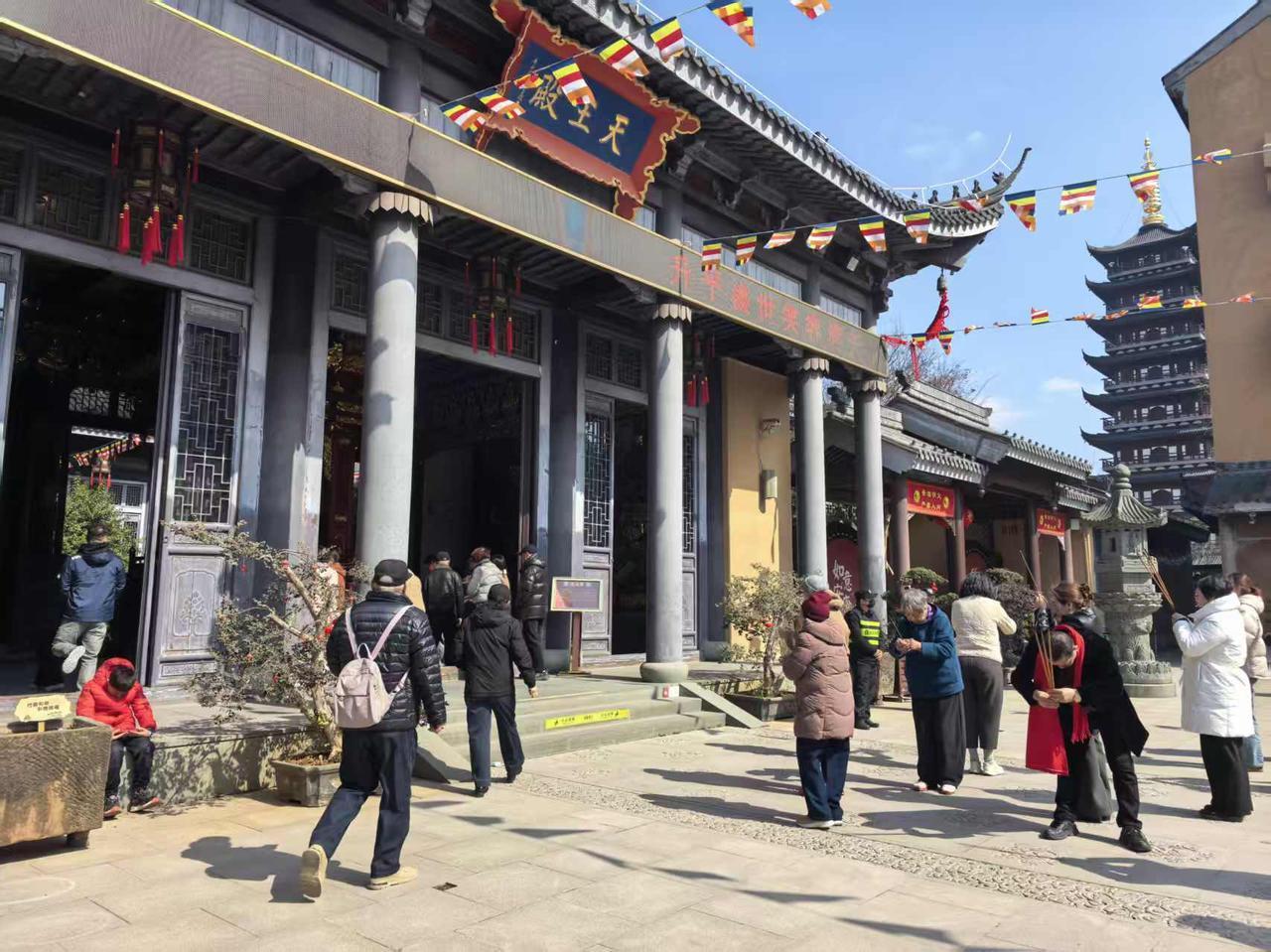 大年初一,起来先吃一碗汤圆,寓意团团圆圆。 然后又吃了一块柿子饼,寓意柿柿如意。 临近11点,出发去宁国禅寺,没想到这里也是人山人海,外面清香烧香拜佛的香客,挤满了。 里面吃斋面的餐厅,长长的队伍,由里面排到外面,绵延有一公里,很夸张。 宁国禅寺的佛教气氛浓,商业方面淡。在南大门进口处,义工给每位进入寺庙的香客发放免费的一炷香。当然,香客也可以进入自由购买高香、香烛、太岁祭品等物品。 我在里面一直兜兜转转到13:00,看着依然长长的吃面队伍,估摸着等不找了,就启程回家了。