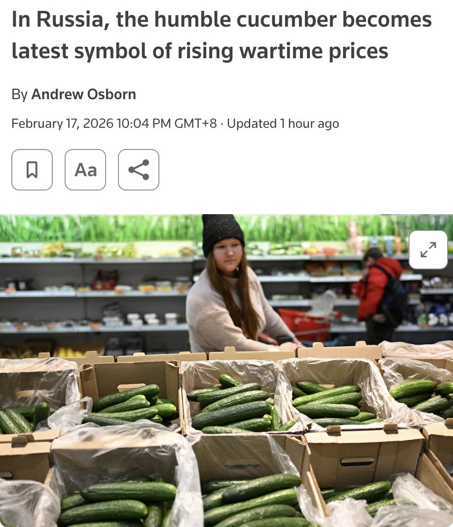 外媒:在俄罗斯,黄瓜价格飙升成为战争时期物价上涨的最新象征。自去年12月以来,黄瓜价格已翻倍,目前平均售价超过300卢布(约合3.91美元)/公斤,社交媒体上甚至出现其售价超过香蕉等进口水果的情况。 俄罗斯反垄断监管机构已要求生产商和零售商解释价格上涨原因。部分议员呼吁对基本食品的零售加价幅度设限。 尽管生产商表示随着天气变暖,黄瓜价格有望在下月下降,但这一现象仍引发了消费者对物价上涨的担忧,尤其是在俄罗斯经济因战争而放缓的背景下,今年整体物价已上涨2.1%,预计全年通胀率可能高达5.5%。