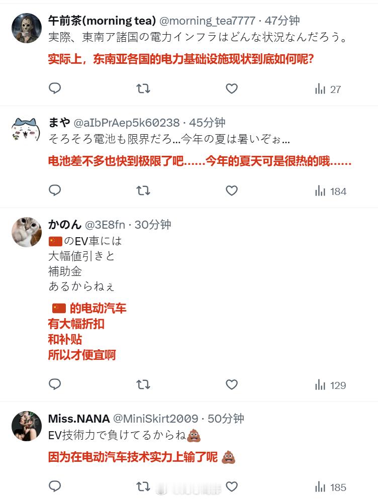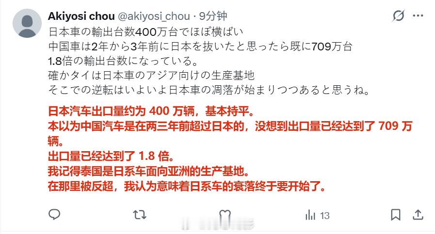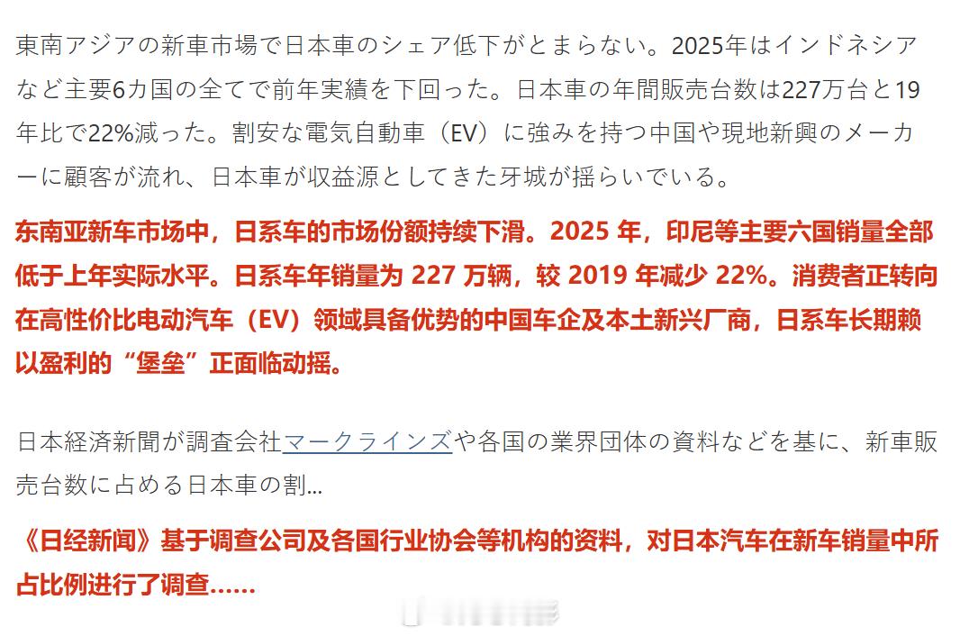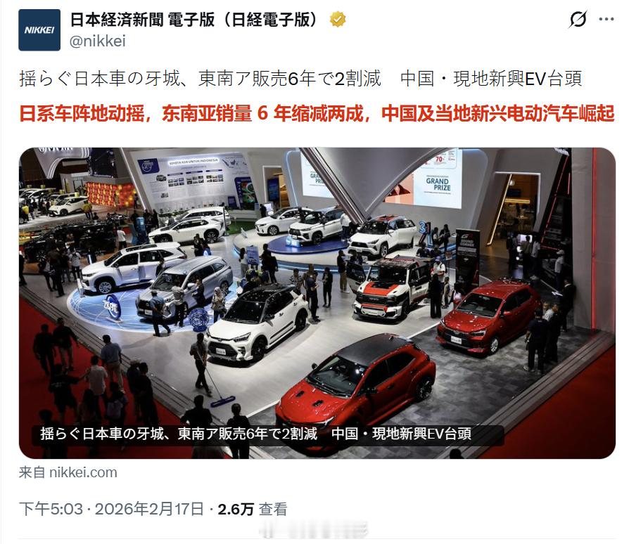 日本媒体报道,日本汽车在东南亚市场的销量在过去六年间下降了约 20%。其背景是受到中国制造商和当地新兴电动汽车品牌迅速崛起的影响。从评论区看,一些日本人依然在对日本车的未来抱有侥幸心理。。