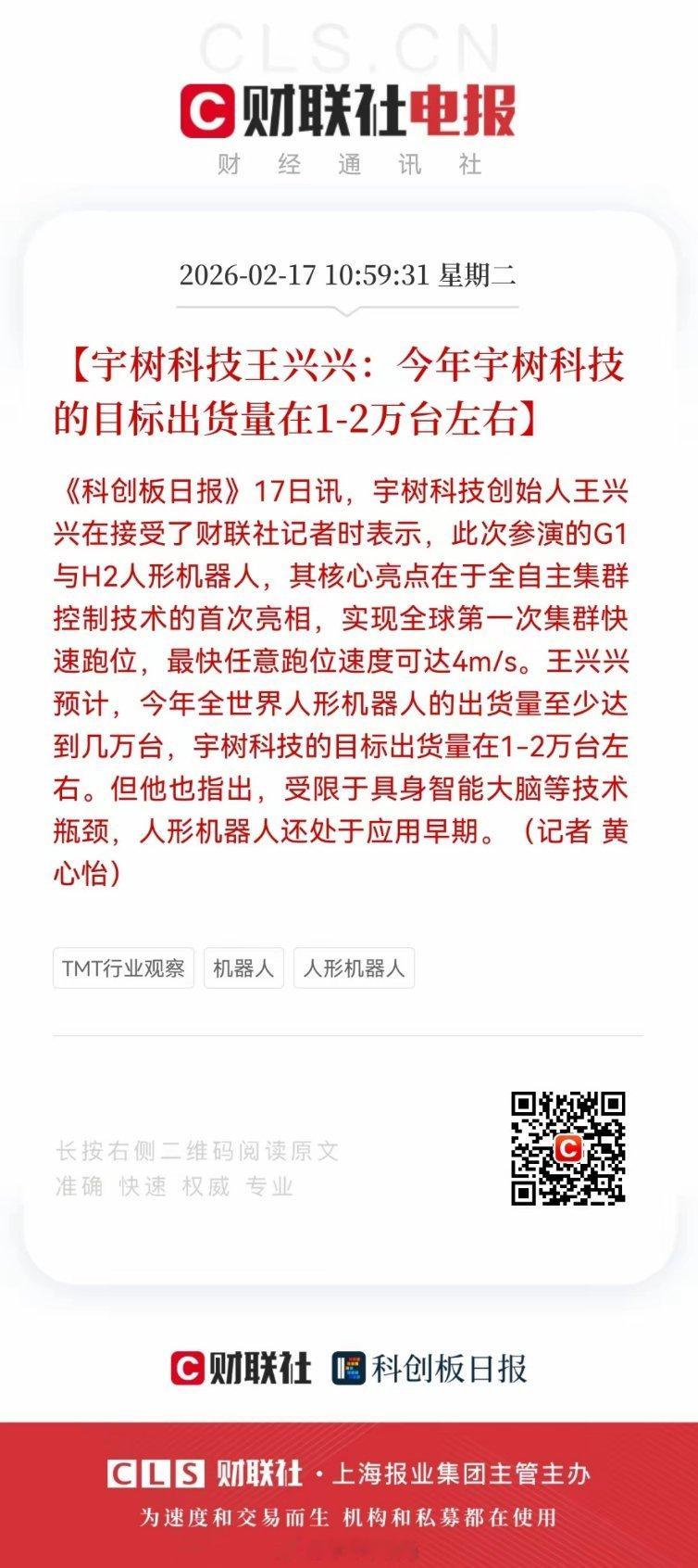 利好!大利好消息!宇树机器人产业链迎来重大利好,宇树科技王兴兴称,今年宇树科技的目标出货量在1-2万台左右,相关产业链将迎更多投资机遇。在春晚舞台上,宇树科技的G1与H2人形机器人以4m/s的速度完成全球首次集群快速跑位,将“赛博功夫”演绎得淋漓尽致。而在聚光灯之外,创始人王兴兴向财联社记者透露了更具分量的行业判断:2026年全球人形机器人出货量将达到数万台,宇树科技的目标是占据其中1-2万台的份额。这一数字不仅是企业野心的体现,更是对整个行业发展阶段的精准锚定。支撑宇树科技这一目标的,是其在春晚表演中惊艳亮相的全自主集群控制技术。与去年春晚机器人“慢慢走”变换队形不同,今年的表演实现了质的飞跃:数十台机器人在高速奔跑中穿插变阵,同步完成武术动作,跑位速度最高可达4米/秒,同时保持了毫米级的运动精度。这种突破不仅解决了多机器人轨迹规划与碰撞规避的世界级难题,更证明了其技术在复杂场景下的稳定性与可靠性,为大规模商业化应用奠定了基础。然而,在技术突破的光环下,王兴兴的表述却异常清醒。他明确指出,受限于具身智能大脑等技术瓶颈,人形机器人仍处于应用早期。这一判断与行业共识不谋而合。当前,人形机器人的硬件成熟度整体领先于软件和智能层面,虽然关节、传感器等硬件成本已大幅下降,但“大脑”的认知能力与“身体”的运动控制之间仍存在巨大鸿沟。复杂的模型运算导致机器人必须“停下来思考”才能做决定,无法像人类一样边行动边调整,这成为制约其大规模商业化的核心瓶颈。从全球格局来看,宇树科技1-2万台的出货目标,几乎占据了瑞银等机构预测的2026年全球3万台总需求的半壁江山。这既是对自身技术实力的自信,也反映了中国企业在人形机器人赛道的领先地位。随着方正电机、奥比中光等核心供应链伙伴的技术成熟,宇树科技的量产能力得到了有力支撑。但同时,这也意味着其将直面特斯拉Optimus等国际巨头的直接竞争,行业的淘汰赛已然打响。对于资本市场而言,宇树科技的目标出货量无疑是一剂强心针。但更值得关注的是其背后传递的信号:人形机器人的发展,正从概念验证的“炫技”阶段,迈入以技术落地和商业验证为核心的深水区。在这个过程中,只有那些既能在技术上实现突破,又能在商业上保持清醒的企业,才能最终穿越周期,成为行业的真正引领者。