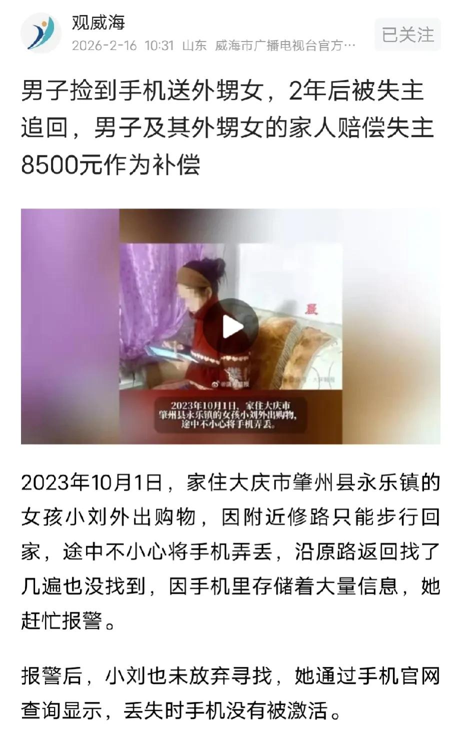 贪小便宜吃大亏!黑龙江大庆,男子在路上捡得一部苹果手机,激动不已,为了保险起见,他等了一段时间后才刷机当礼物送给外甥女,没想到,2年后民警找到他外甥女,最终男子和外甥女合计赔了8500元给失主。网友:东西是不能乱捡的。 2023年10月1号那天,大李去修路回到半路,突然看到地上一个黑色的东西,他走进一看是一部苹果手机。 他看了看四周空无一人,他赶紧捡起来踹兜里,手机看起来还很新,应该是刚买不久。 大李知道捡了东西应该上交的道理,可一时的贪念让他犹豫了,反正四下无人,又没有监控,他不说出去谁知道呢,先拿回去了再说。 大李把手机带回去后,他谁都没说,手机藏得好好的,他打算先放一段时间,如果有人找到他,他就交出去,如果无人问,他再另做打算。 大李等了大概一个多月后,相安无事,他觉得应该安全了,于是拿着手机到维修店让人刷机再使用。 大李一直很疼爱他的外甥女,这个苹果手机太贵,他不舍得用,也不太会用,于是把手机寄到沈阳给外甥女了。 他觉得把手机寄到那么远的地方用起来也绝对安全。 大李的外甥女收到舅舅寄来的礼物,别提有多开心,那手机跟新的一样,她正需要呢,谢过舅舅后,她心安理得地使用起来。 本以为这件事也就这么过去了,谁料,今年1月份的时候,大李的外甥女突然接到警方电话,说她使用的那部手机是别人的,失主已经找到她了。 外甥女一听既着急又尴尬,感觉自己像偷了东西似的,不知道受到怎样的处罚。 原来这部手机是大庆的小刘弄丢的,2023年10月1号她走路出门买东西,返回家的时候手机不小心掉路上,等她原路返回找,大李已经捡回家了。 当时手机刚买不久,花费6000元,连电话卡都没放,不过小刘倒是用手机链接wifi下载和储存了很多资料。 手机丢失后,小刘着急不已,她当即报了警,但是由于该路段没有监控,加上手机是出于未激活状态,所以手机下落一直没有消息。 小刘曾经通过官网试图找回,但是由于当时备考,时间紧,她也没有多用心,所以这事就这么被搁置了。 转眼到了2024年8月份,小刘再次通过官网查询,发现手机已经被激活使用。 今年年初,小刘联系手机厂家,申请查询丢失手机的信息。厂家很快回复:这部手机已经在绥化被刷机,现在正在沈阳被人使用,并把相关信息提供给了她。 所以,警方很快找到大李的外甥女。 本以为天衣无缝的小事,最终还是露出了马脚,真相也一步步浮出水面。 捡手机本可归还,大李却因贪念藏起手机,刷机后送给外甥女。 他以为无人知晓、远送沈阳便万事大吉,没想到手机仍被厂家定位到使用信息。 两年后,警方找上门,两人最终赔偿失主8500元。一时贪小便宜,换来赔钱又尴尬,真是贪小便宜吃大亏。 拾得他人财物理应归还,切莫心存侥幸,否则只会自食恶果。 最终双方通过协商,大李和外甥女家人一起赔偿小刘8500元,其中6000元是手机费用,2000元是删除资料补偿,500元是小刘找手机的花销。 那么,这件事涉及到哪些法律常识呢? 根据《民法典》第314条规定:拾得遗失物,应当返还权利人。拾得人应当及时通知权利人领取,或者送交公安等有关部门。 大李捡到手机后没有归还,反而刷机赠与他人,属于侵占遗失物,违反了法定义务,同时造成失主资料丢失与财产损失,依法应承担赔偿责任,这也印证了贪小便宜最终会付出更大代价。 这件事也给大家敲响了警钟:捡到他人财物拒不归还,不仅有违道德,更触犯法律。 大李心存侥幸,将捡到的手机刷机送人,最终仍被查到并赔偿8500元,落得得不偿失的下场。 法律不会纵容不当得利,一时贪小便宜,只会换来更大损失。 我们应始终坚守拾金不昧的底线,自觉遵守法律,切莫因小失大。