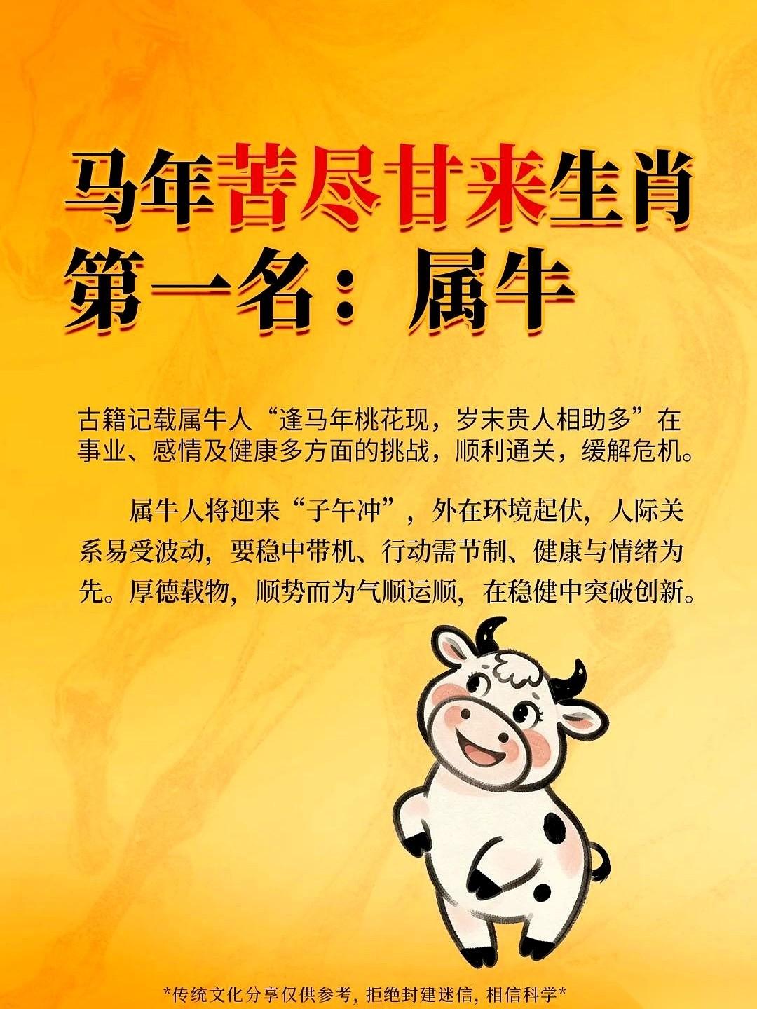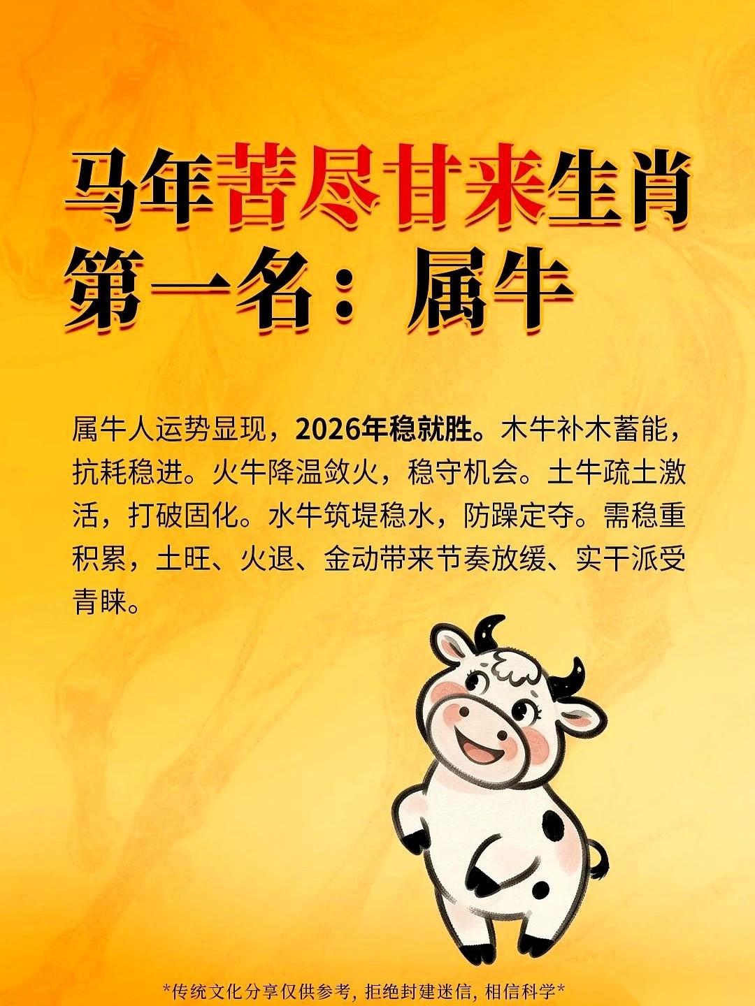 所有属牛的,我只说一句。 过去几年,你是不是总感觉自己像个透明人?活干得最多,锅背得最黑,好处永远没你的份儿。汇报工作,嘴笨得像被胶水粘住,功劳全被旁边那个会说的抢走。庆功宴上,你只能在角落里埋头扒饭,看着别人在台上领奖。 一口气憋着,没人懂。 但你记住了,2026年,这口气,要扬眉吐气地给我换过来。 以前躲着你走的人,现在主动凑过来给你递烟、倒茶。以前你啃不动的硬骨头项目,现在那个最难搞的领导,竟然亲自把你叫到办公室,门一关,拍着你肩膀说:“这个事,只有你行。” 钱,也不是天上掉的,不是风刮来的。你账户里多出来的每一分,都是你过去一锤一锤敲出来的砖,一滴一滴淌出来的汗。别听人瞎忽悠,把真金白银攥在自己手里,那才叫心里不慌。 推开家门,不再是冷冰冰的四面墙。有人给你留了灯,桌上有一碗热汤。以前你觉得是拖累的那些人,今年会用行动告诉你,他们才是你最硬的靠山。 记住,老天爷不会亏待任何一个埋头干活的人,只是你的快递,发货慢了点。 你是哪一年的牛?来说说,最想在哪件事上,第一个翻身?